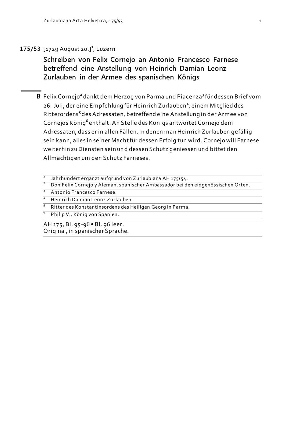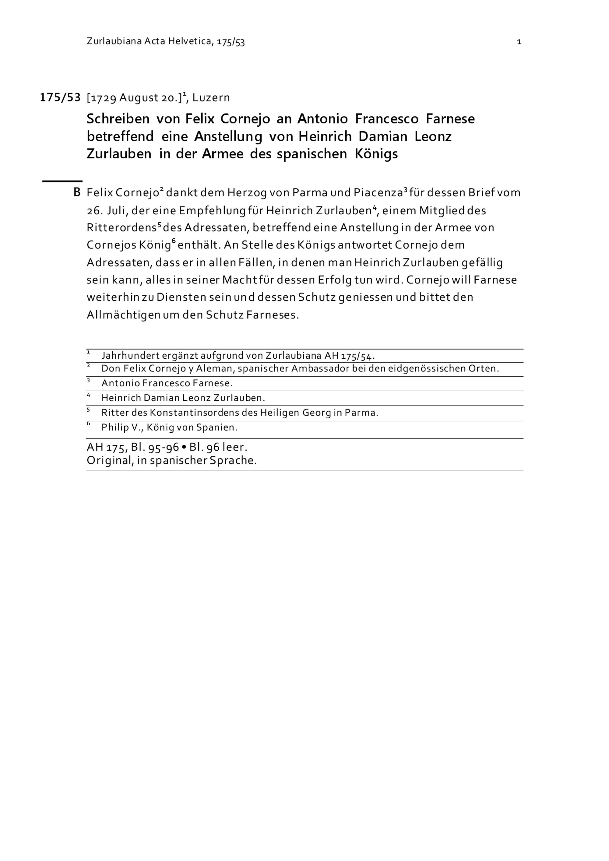 Schreiben von Felix Cornejo an Antonio Francesco Farnese, Herzog, betreffend eine Anstellung von Heinrich Damian Leonz Zurlauben in der Armee des spanischen Königs