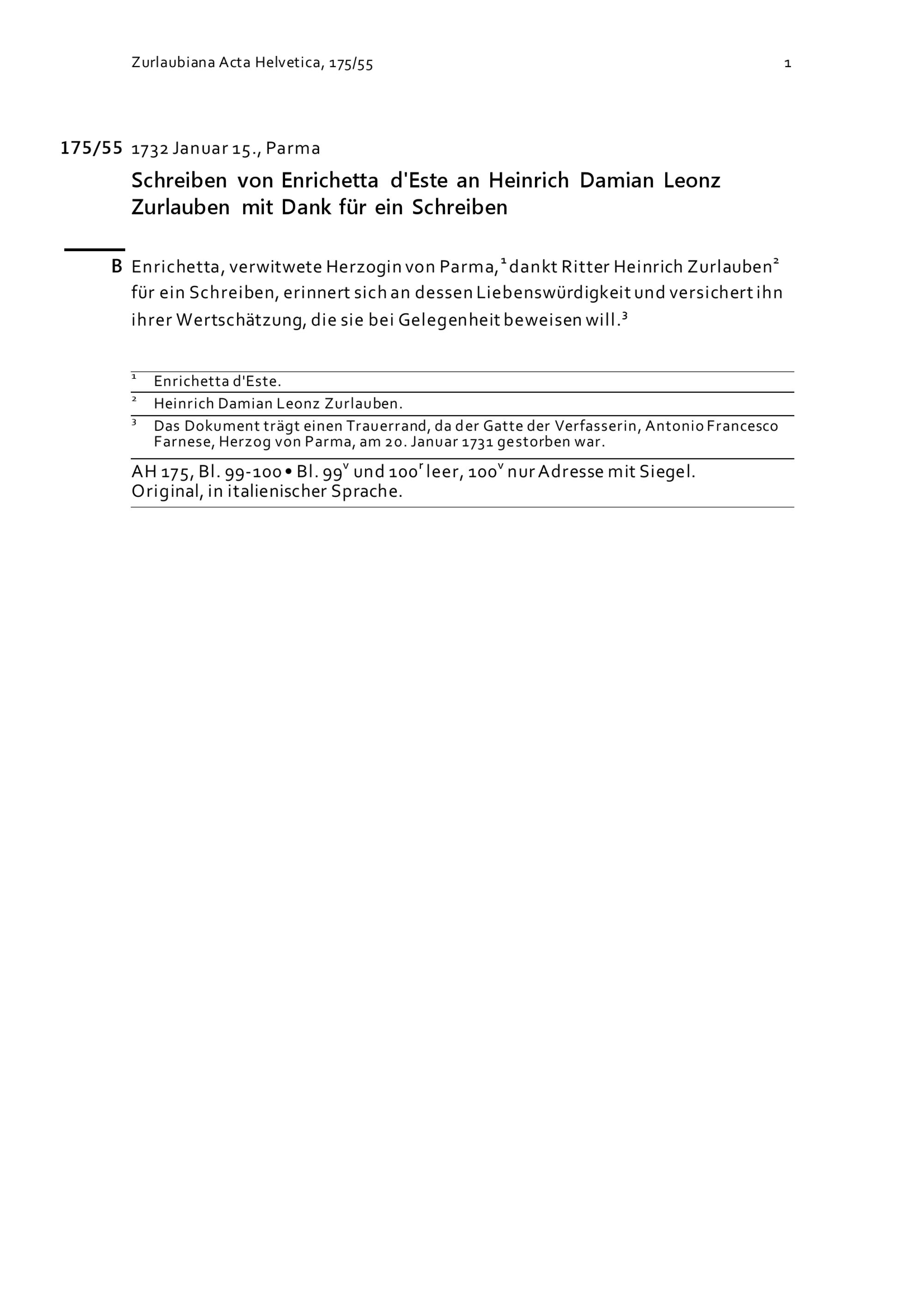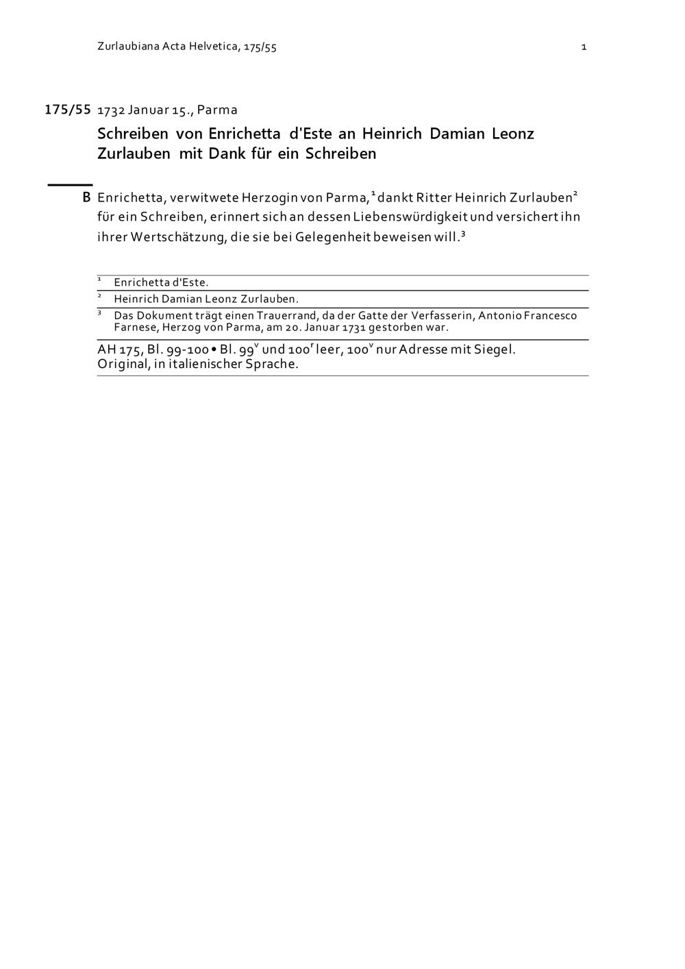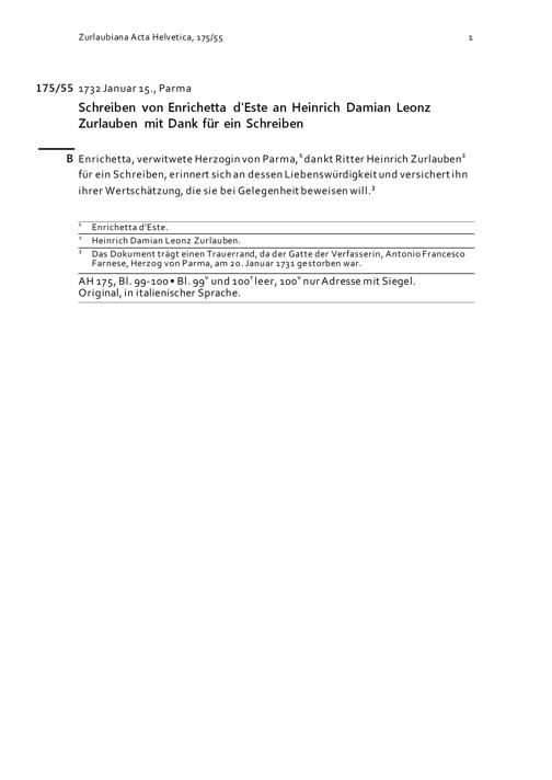 Schreiben von Enrichetta d'Este an Heinrich Damian Leonz Zurlauben mit Dank für ein Schreiben