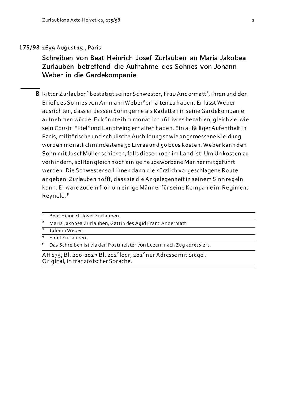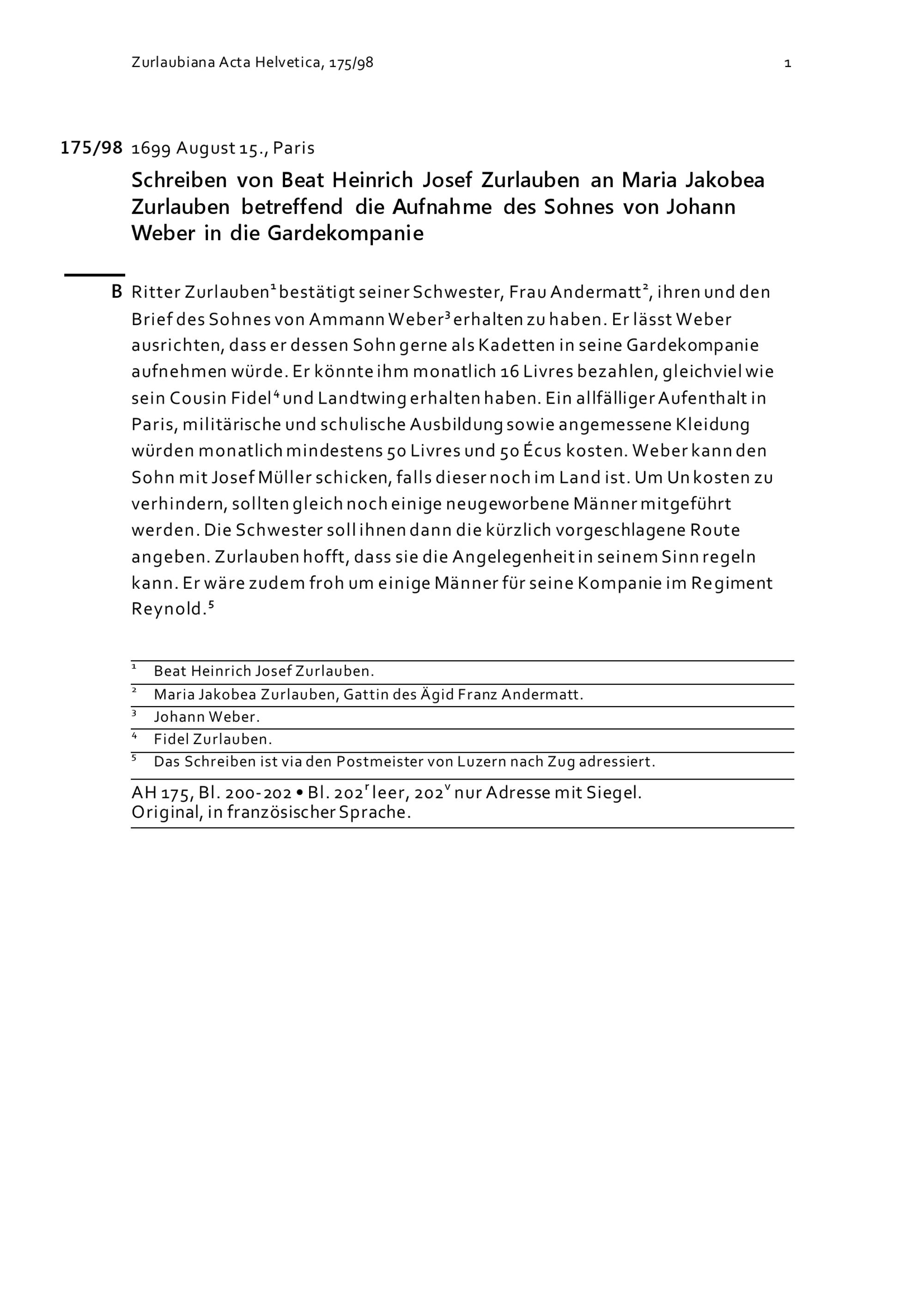 Schreiben von Beat Heinrich Josef Zurlauben an Maria Jakobea Zurlauben betreffend die Aufnahme des Sohns von Johann Weber in die Gardekompanie