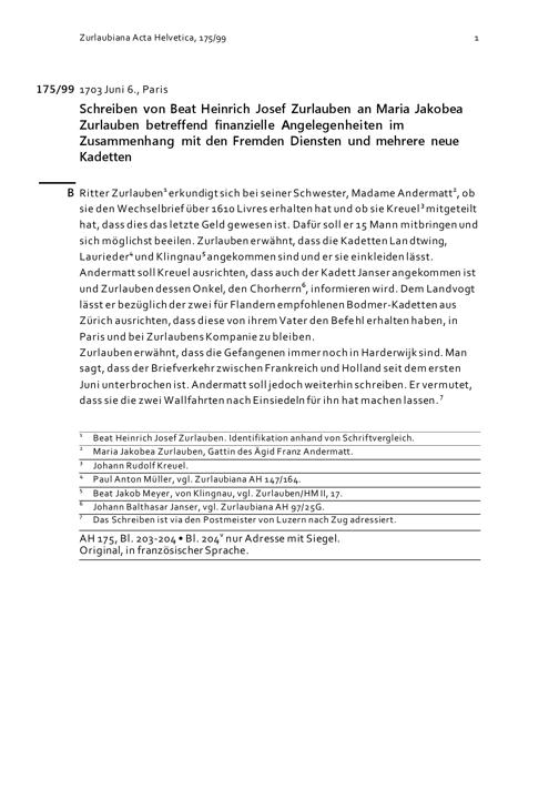 Schreiben von Beat Heinrich Josef Zurlauben an Maria Jakobea Zurlauben betreffend finanzielle Angelegenheiten in Zusammenhang mit den Fremden Diensten und mehrere neue Kadetten