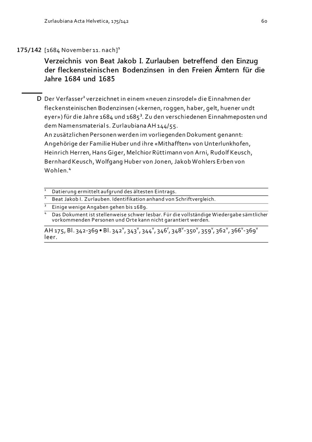 Verzeichnis von Beat Jakob I. Zurlauben betreffend den Einzug der fleckensteinschen Bodenzinsen in den Freien Ämter für die Jahre 1684 und 1685