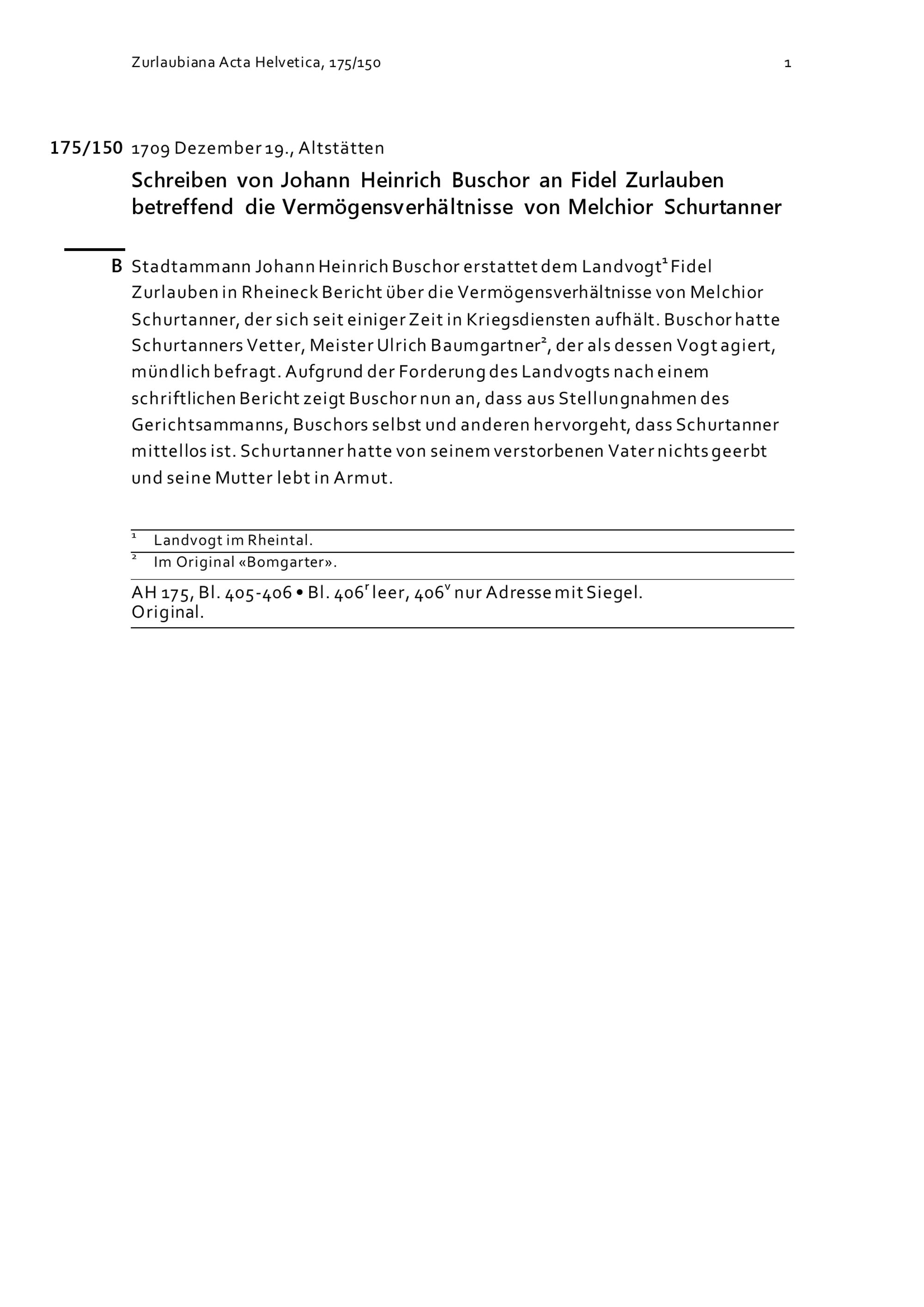 Schreiben von Johann Heinrich Buschor an Fidel Zurlauben betreffend die Vermögensverhältnisse von Melchior Schurtanner