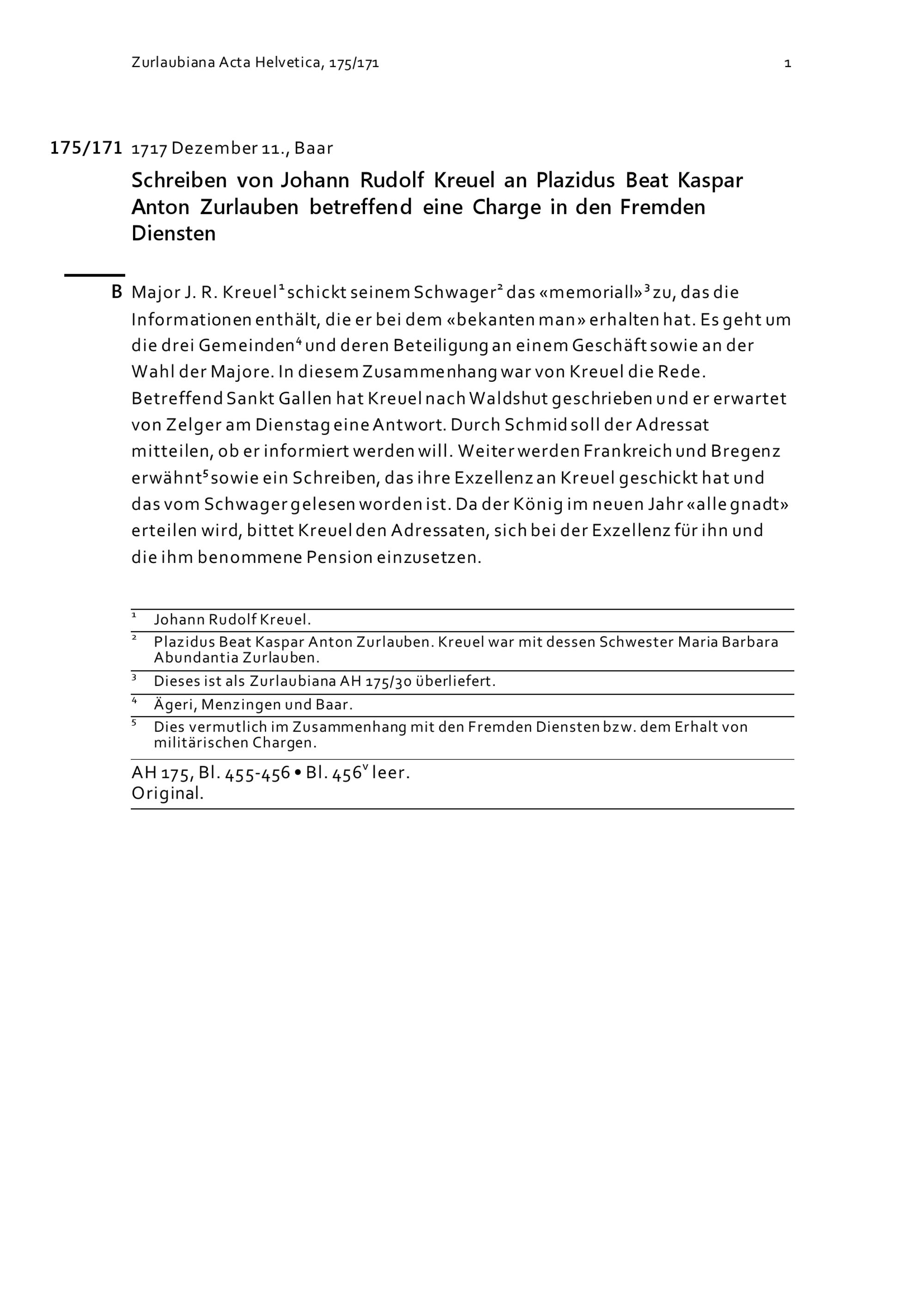Schreiben von Johann Rudolf Kreuel an Plazidus Beat Kaspar Anton Zurlauben betreffend eine Charge in den Fremden Diensten