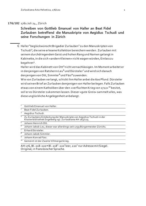 Schreiben von Gottlieb Emanuel von Haller an Beat Fidel Zurlauben betreffend Manuskripte von Aegidius Tschudi und seine Forschungen in Zürich