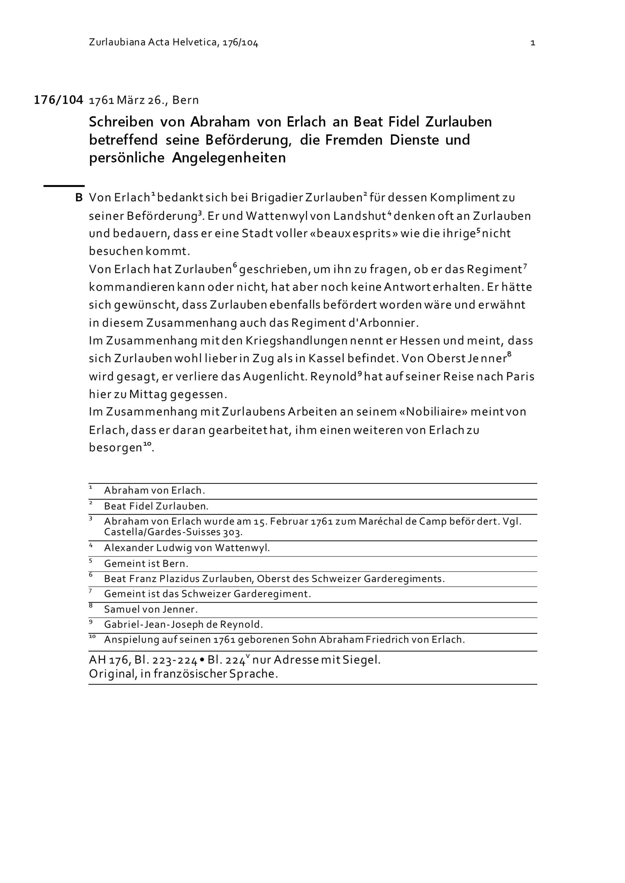 Schreiben von Abraham von Erlach an Beat Fidel Zurlauben betreffend seine Beförderung, die Fremden Dienste und persönliche Angelegenheiten