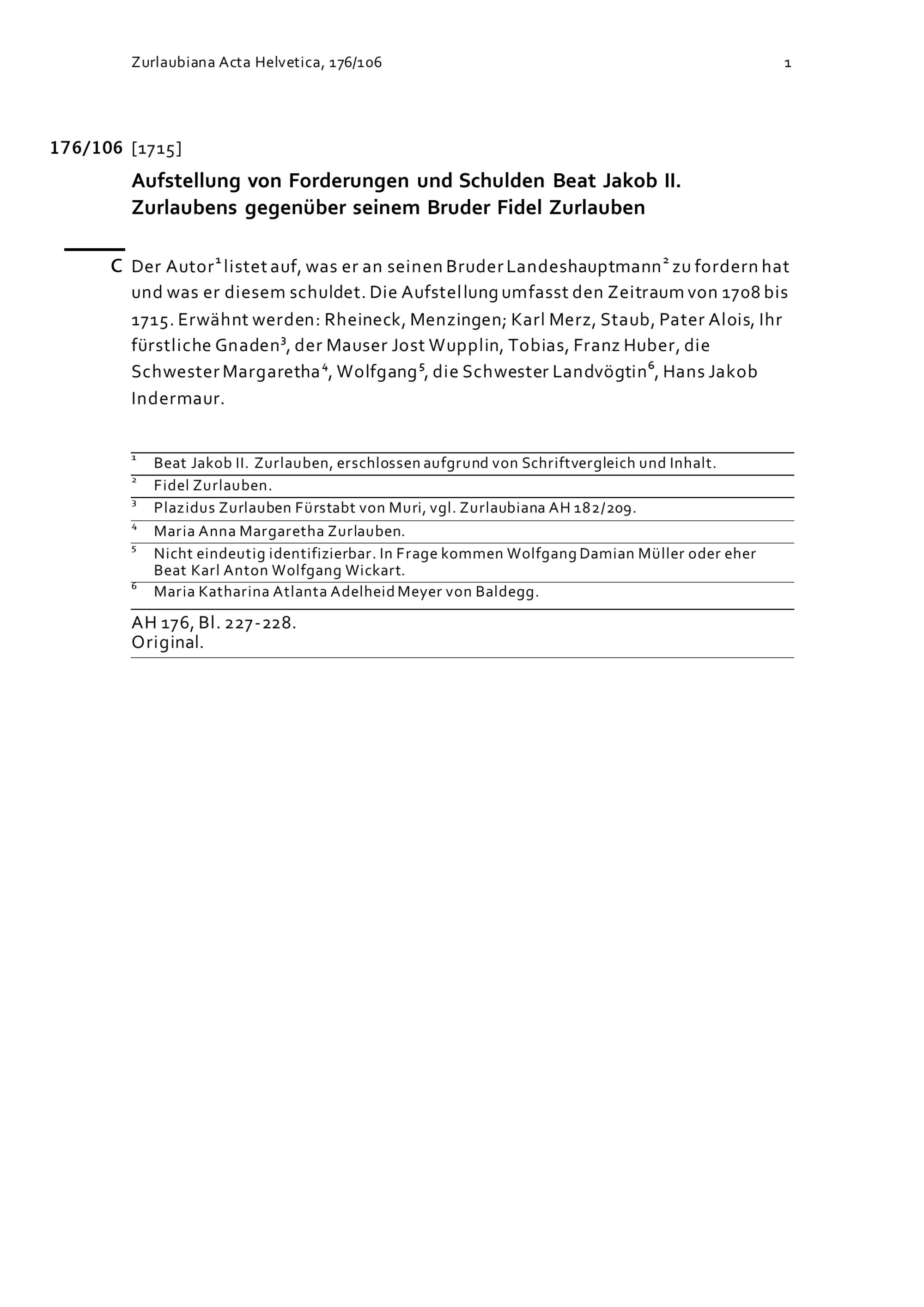 Aufstellung von Forderungen und Schulden Beat Jakob II. Zurlaubens gegenüber seinem Bruder Fidel Zurlauben