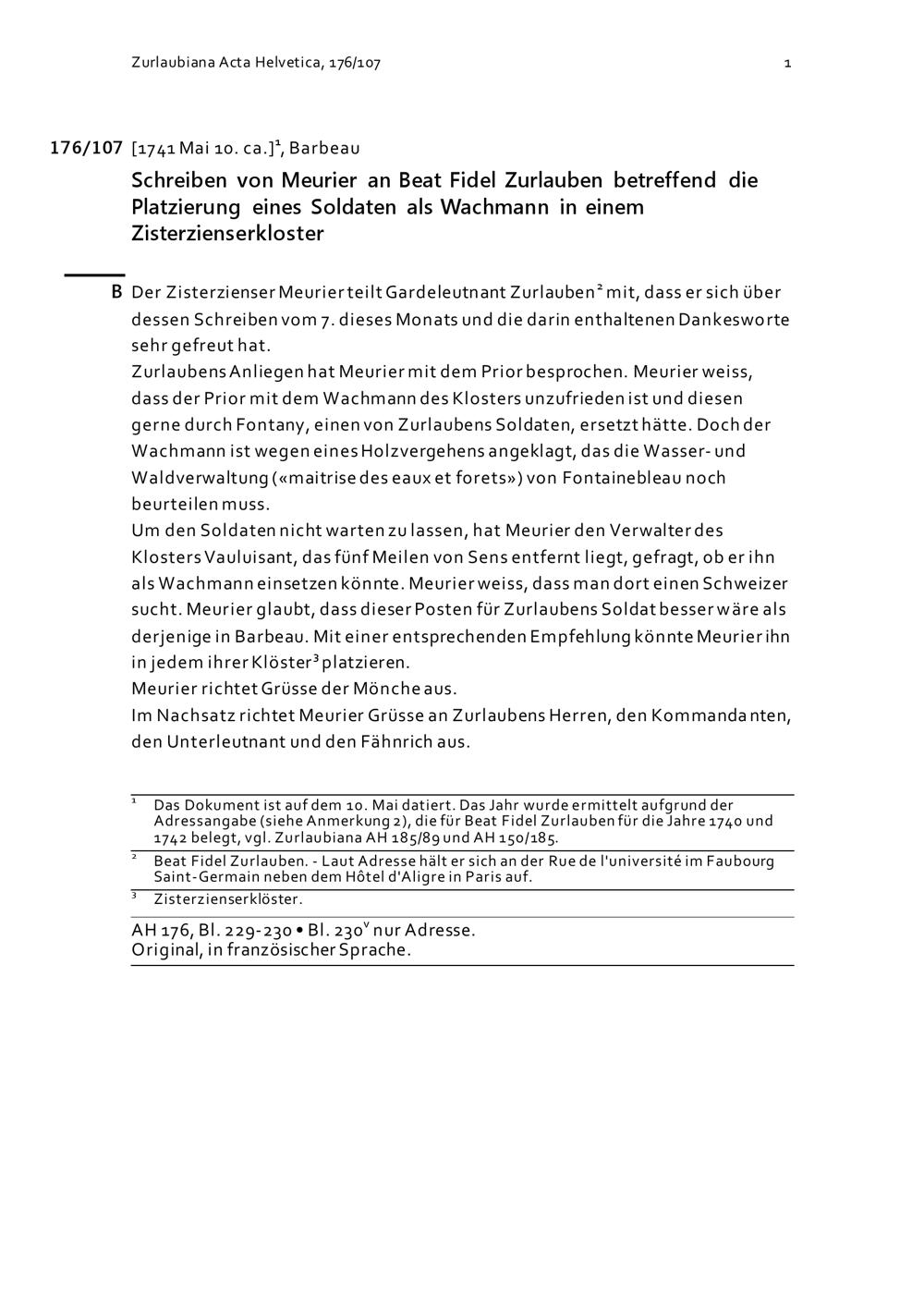 Schreiben von Meurier an Beat Fidel Zurlauben betreffend die Platzierung eines Soldaten als Wachmann in einem Zisterzienserkloster