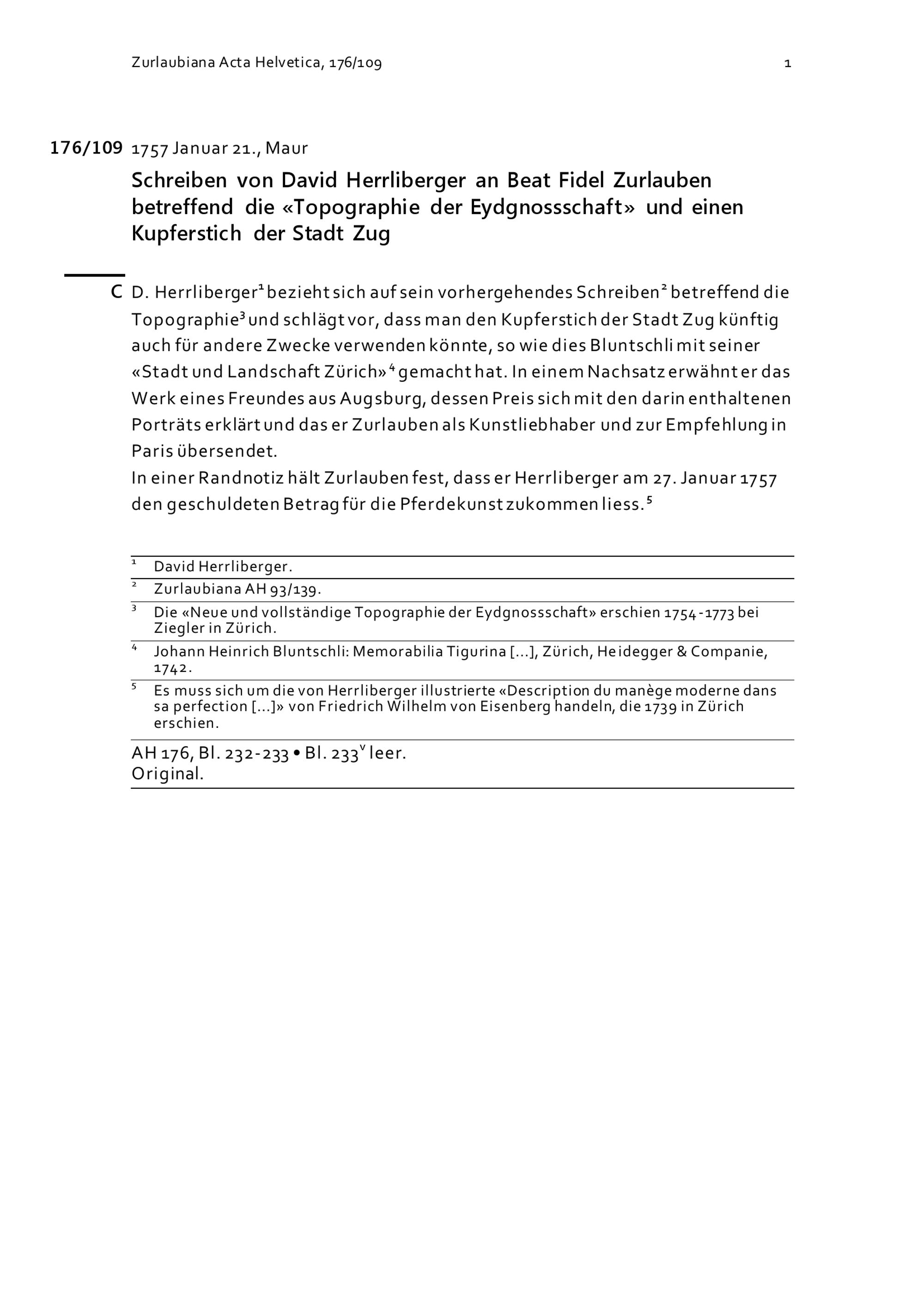 Schreiben von David Herrliberger an Beat Fidel Zurlauben betreffend die «Topographie der Eydgnossschaft» und einen Kupferstich der Stadt Zug