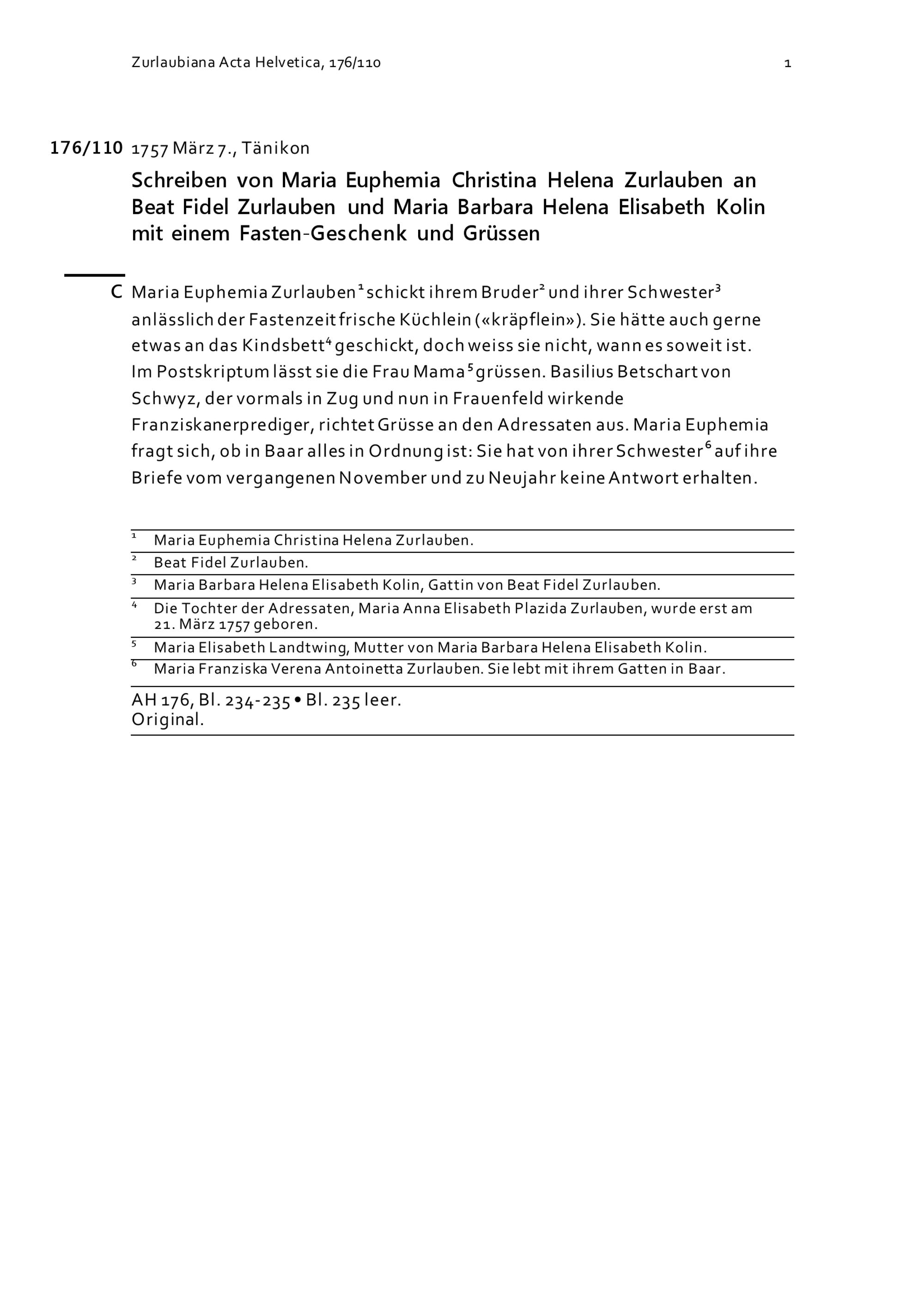 Schreiben von Maria Euphemia Christina Helena Zurlauben, Klosterfrau in Tänikon, an Beat Fidel Zurlauben und Maria Barbara Helena Elisabeth Kolin mit einem Fastengeschenk und Grüssen