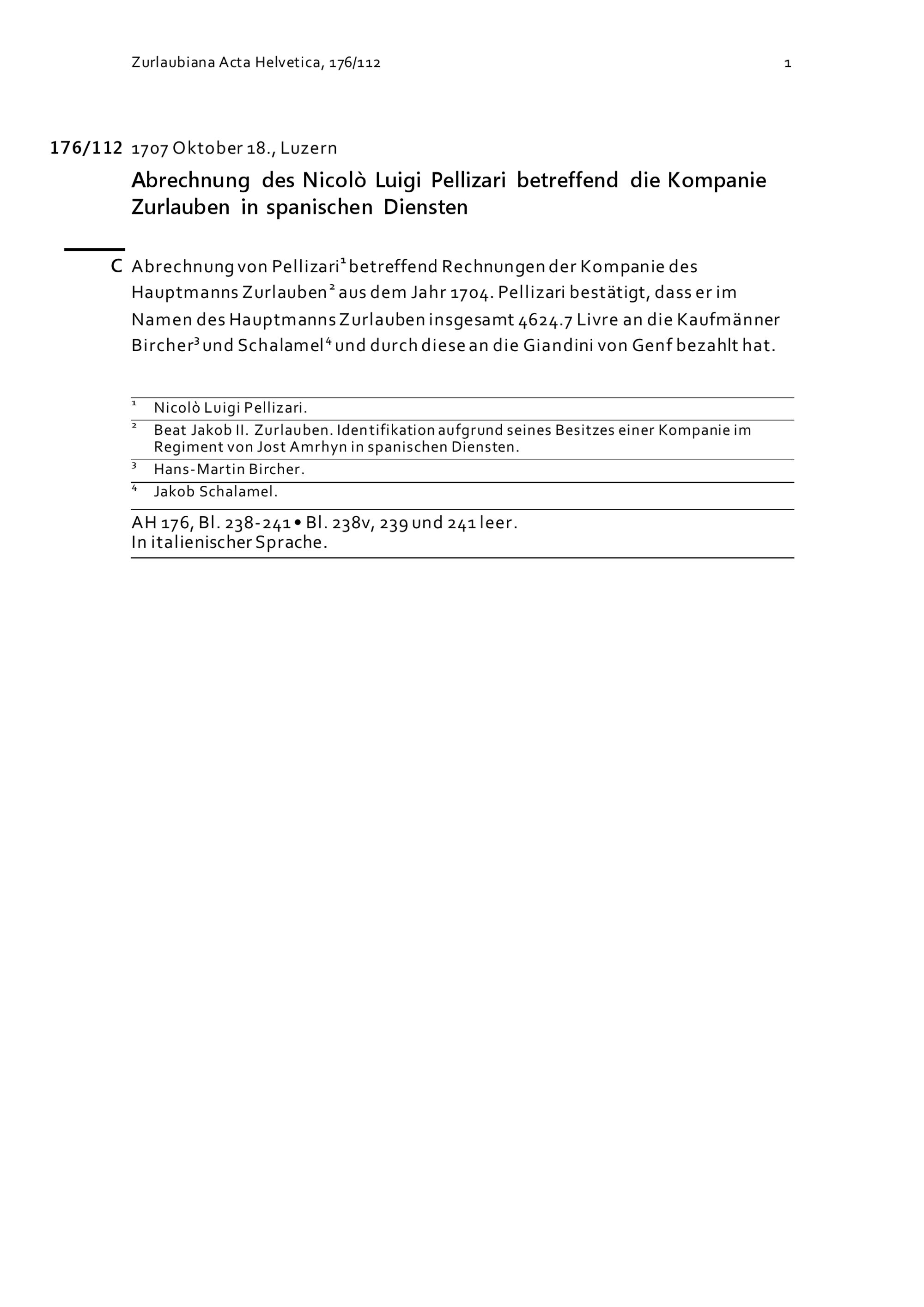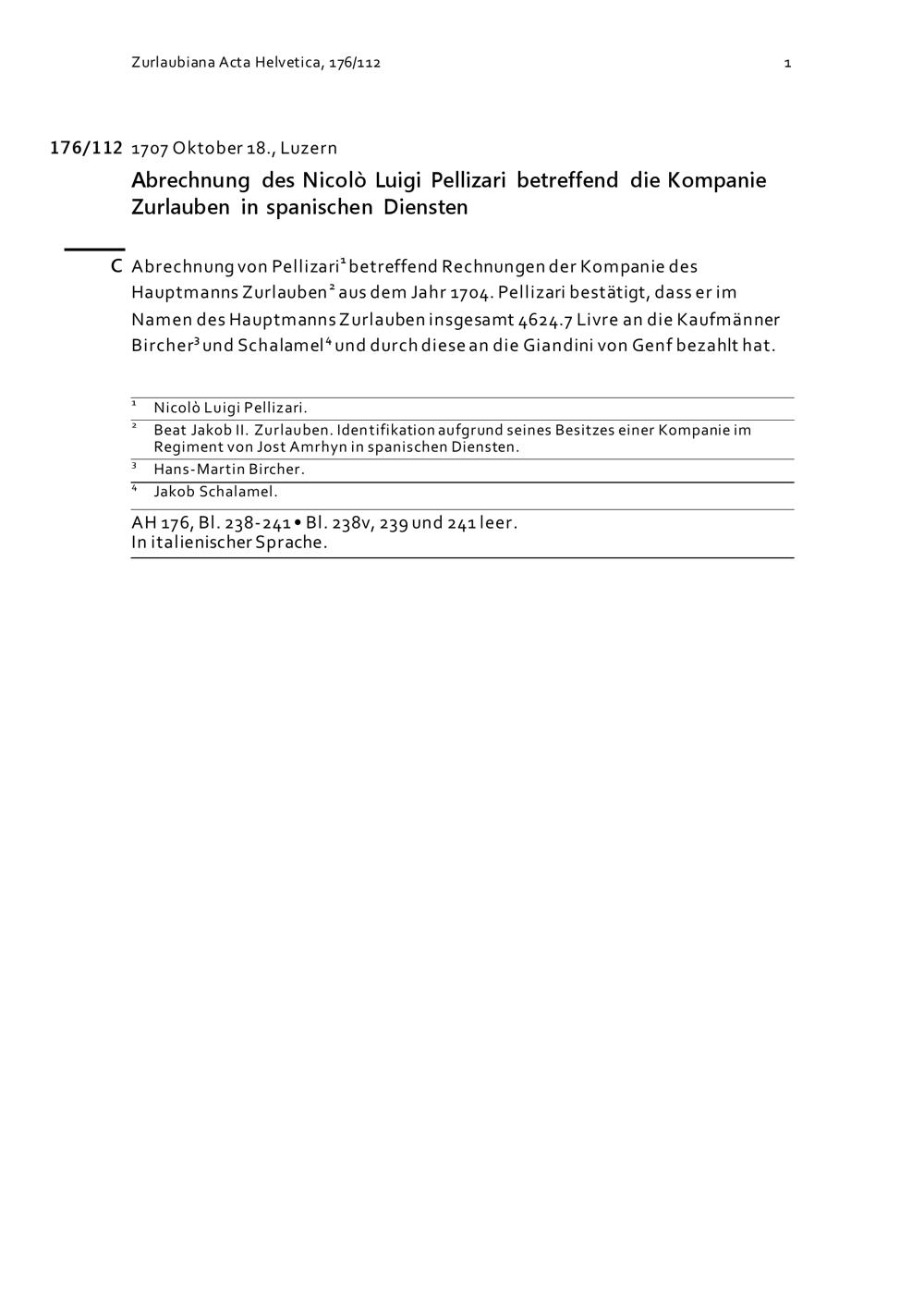 Abrechnung von Nicolo Luigi Pellizari betreffend die Kompanie Zurlauben in spanischen Diensten