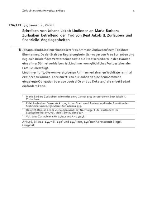 Schreiben von Johann Jakob Lindinner an Maria Barbara Zurlauben betreffend den Tod...