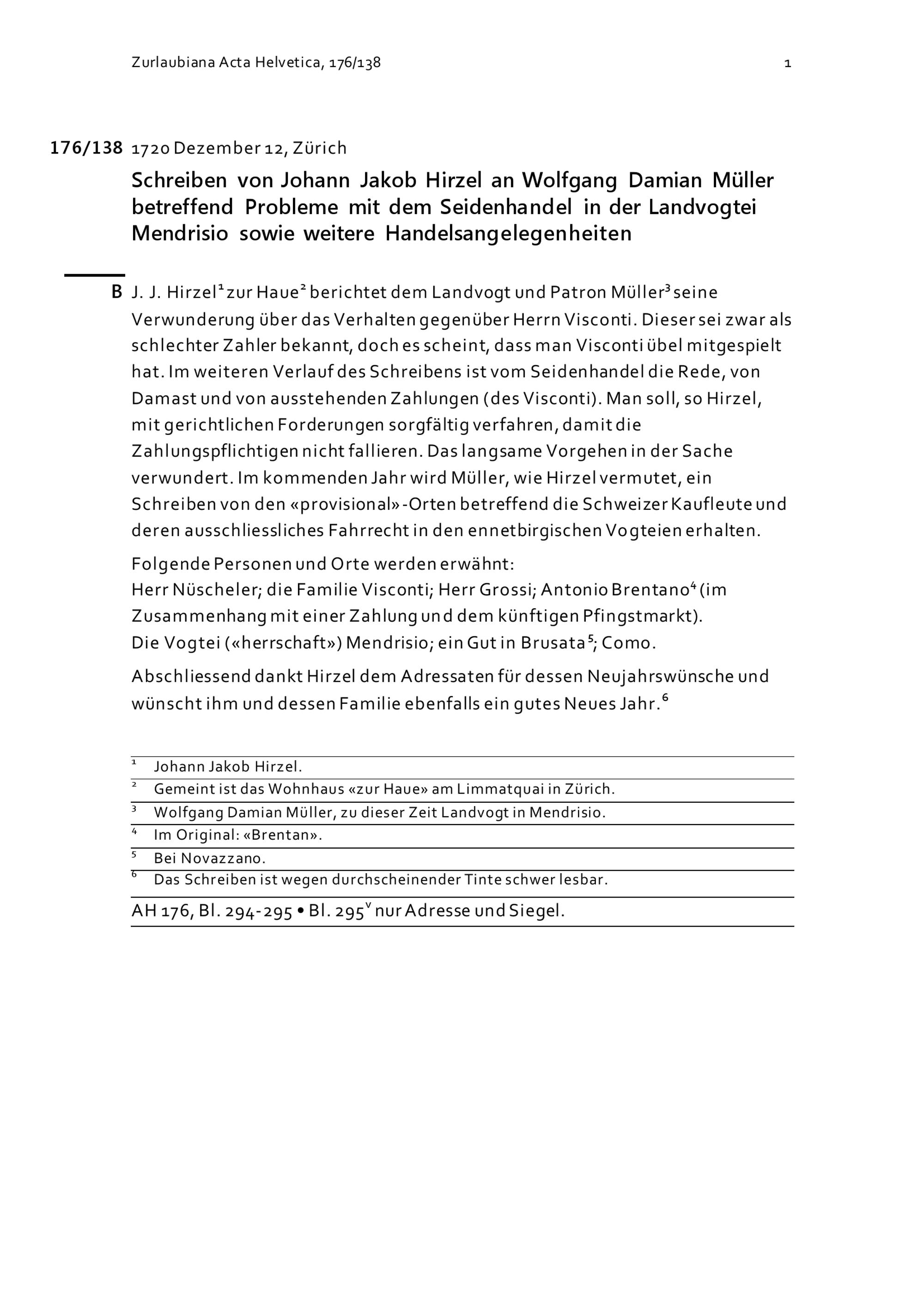 Schreiben von Johann Jakob Hirzel an Wolfgang Damian Müller betreffend Probleme mit dem Seidenhandel in der Landvogtei Mendrisio sowie weitere Handelsangelegenheiten