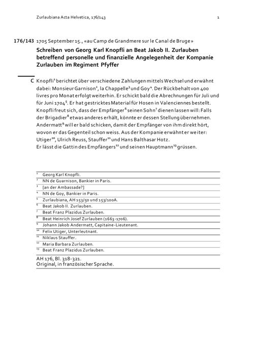 Schreiben von Georg Karl Knopfli an Beat Jakob II. Zurlauben betreffend personelle und finanzielle Angelegenheit der Kompanie Zurlauben im Regiment Pfyffer