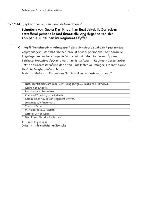 Schreiben von Georg Karl Knopfli an Beat Jakob II. Zurlauben betreffend personelle und finanzielle Angelegenheiten der Kompanie Zurlauben im Regiment Pfyffer