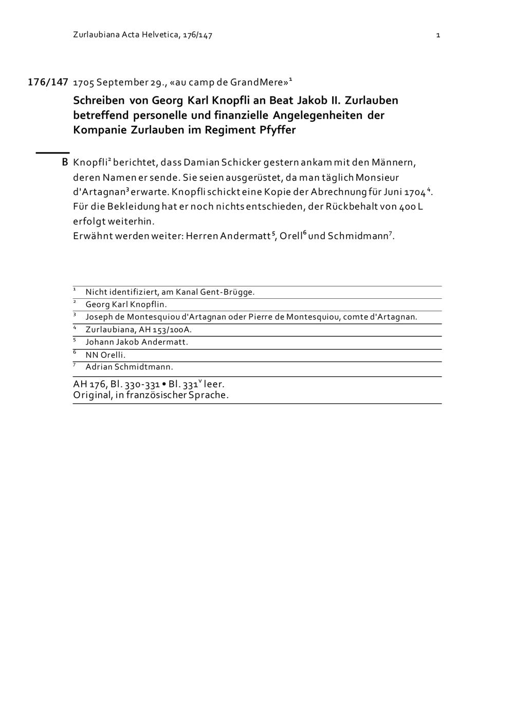 Schreiben von Georg Karl Knopfli an Beat Jakob II. Zurlauben betreffend personelle und finanzielle Angelegenheiten der Kompanie Zurlauben im Regiment Pfyffer