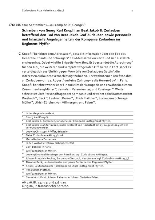Schreiben von Georg Karl Knopfli an Beat Jakob II. Zurlauben betreffend den Tod von Beat Jakob Graf Zurlauben sowie personelle und finanzielle Angelegenheiten der Kompanie Zurlauben im Regiment Pfyffer