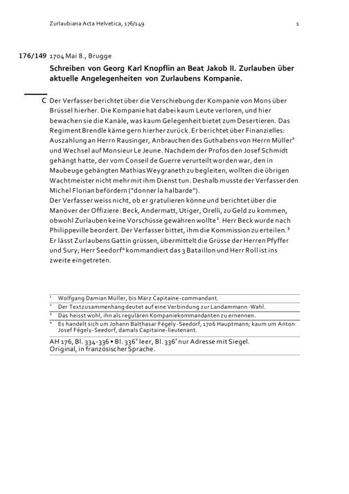Schreiben von Georg Karl Knopfli an Beat Jakob II. Zurlauben über aktuelle Angelegenheiten der Kompanie Zurlauben