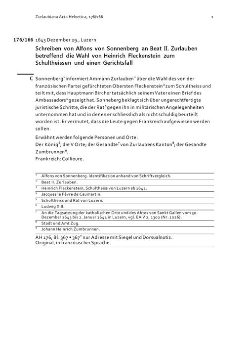 Schreiben von Alfons von Sonnenberg an Beat II. Zurlauben betreffend die Wahl von Heinrich Fleckenstein zum Schultheissen und einen Gerichtsfall