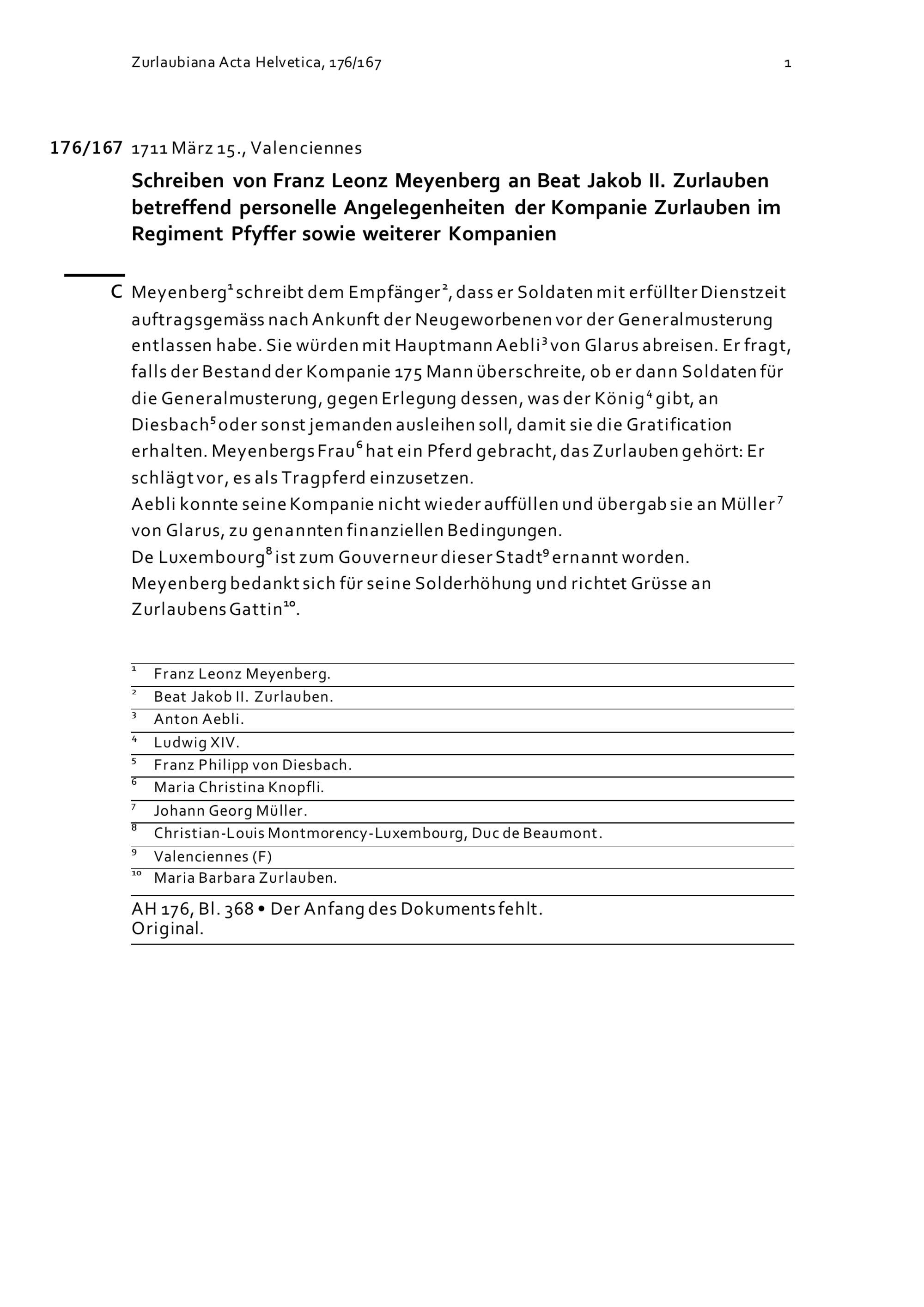 Schreiben von Franz Leonz Meyenberg an Beat Jakob II. Zurlauben betreffend personelle Angelegenheiten der Kompanie Zurlauben im Regiment Pfyffer sowie weiterer Kompanien
