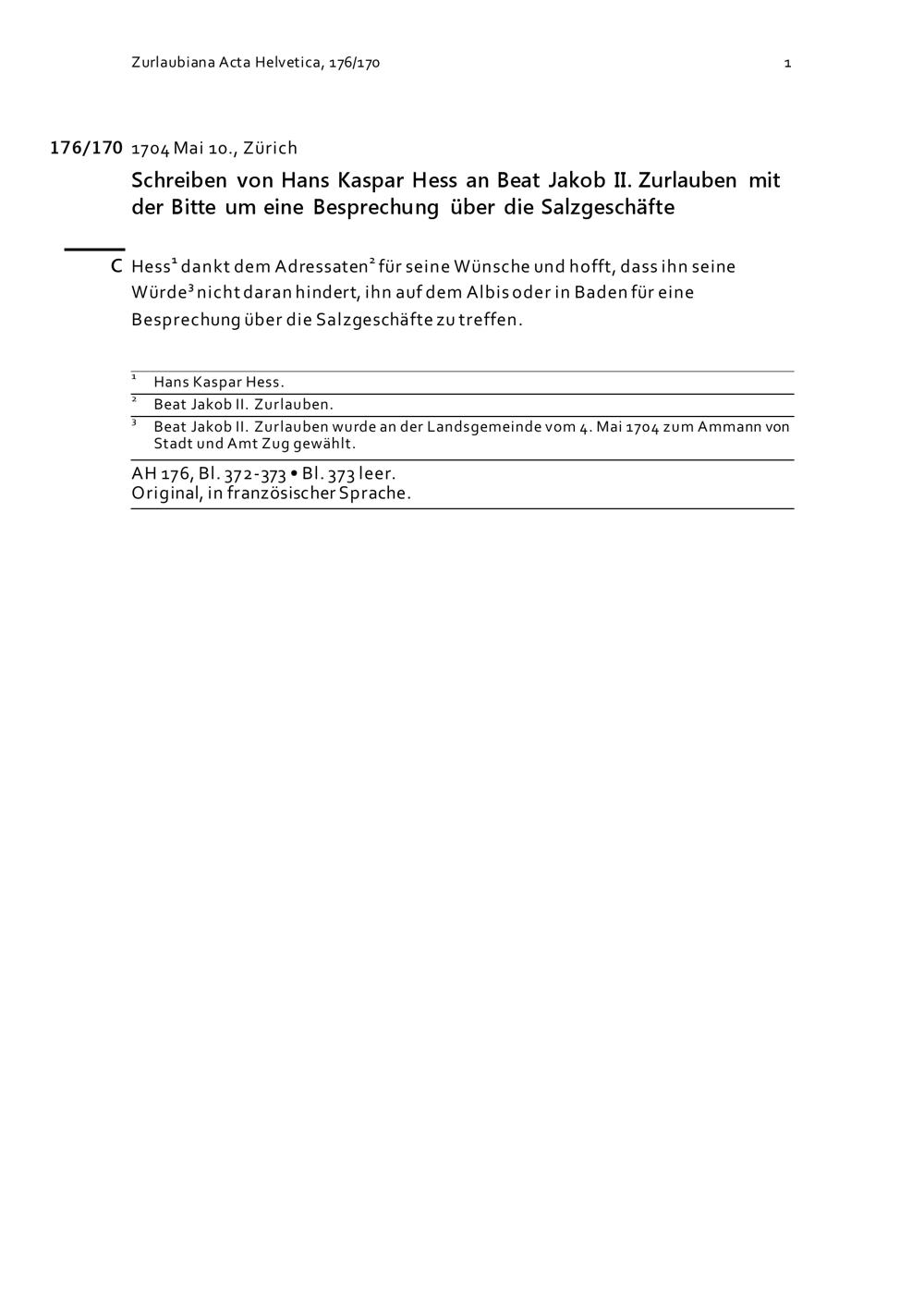 Schreiben von Hans Kaspar Hess an Beat Jakob II. Zurlauben mit der Bitte um eine Besprechung über die Salzgeschäfte