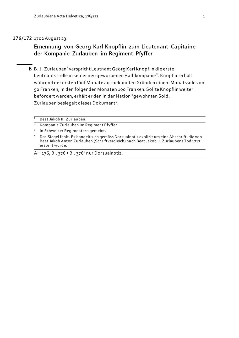 Ernennung von Georg Karl Knopfli zum Lieutenant-Capitaine der Kompanie Zurlauben im Regiment Pfyffer
