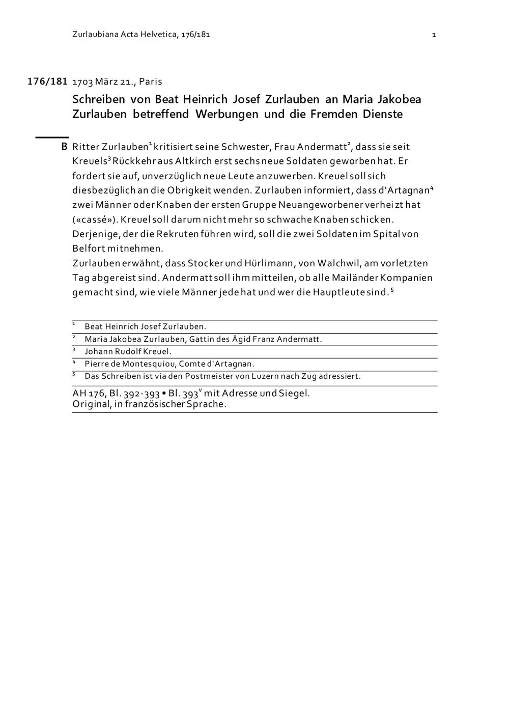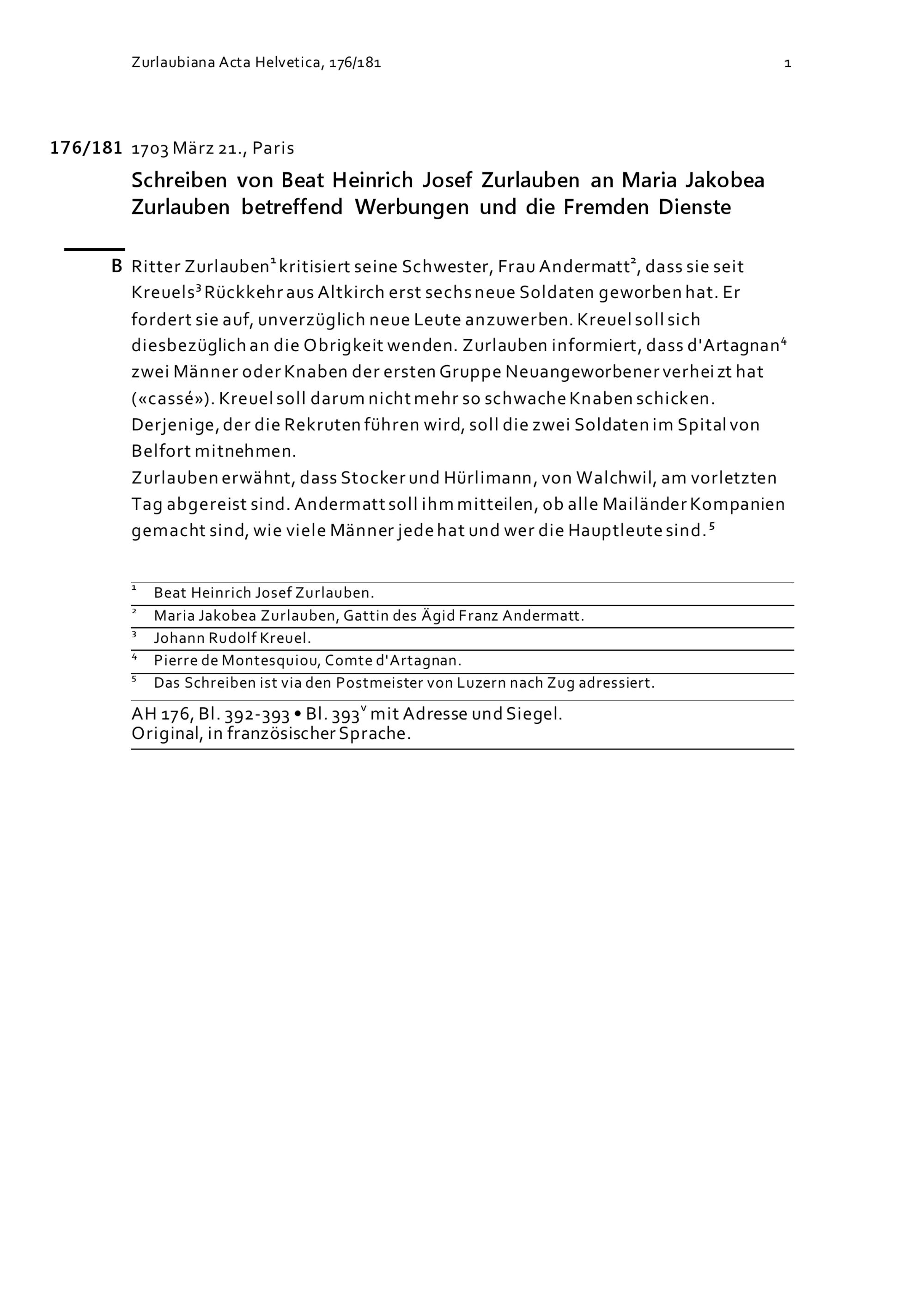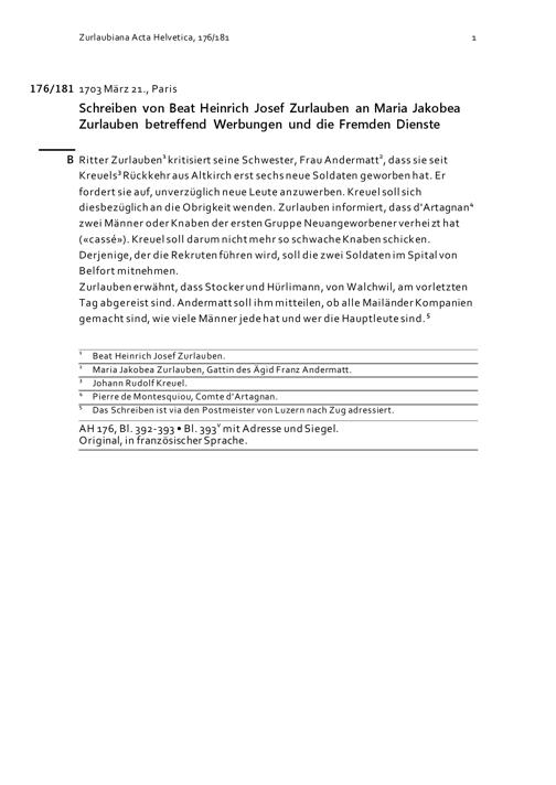 Schreiben von Beat Heinrich Josef Zurlauben an Maria Jakobea Zurlauben betreffend Werbungen und die Fremden Dienste