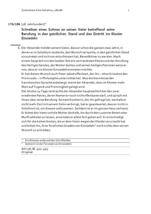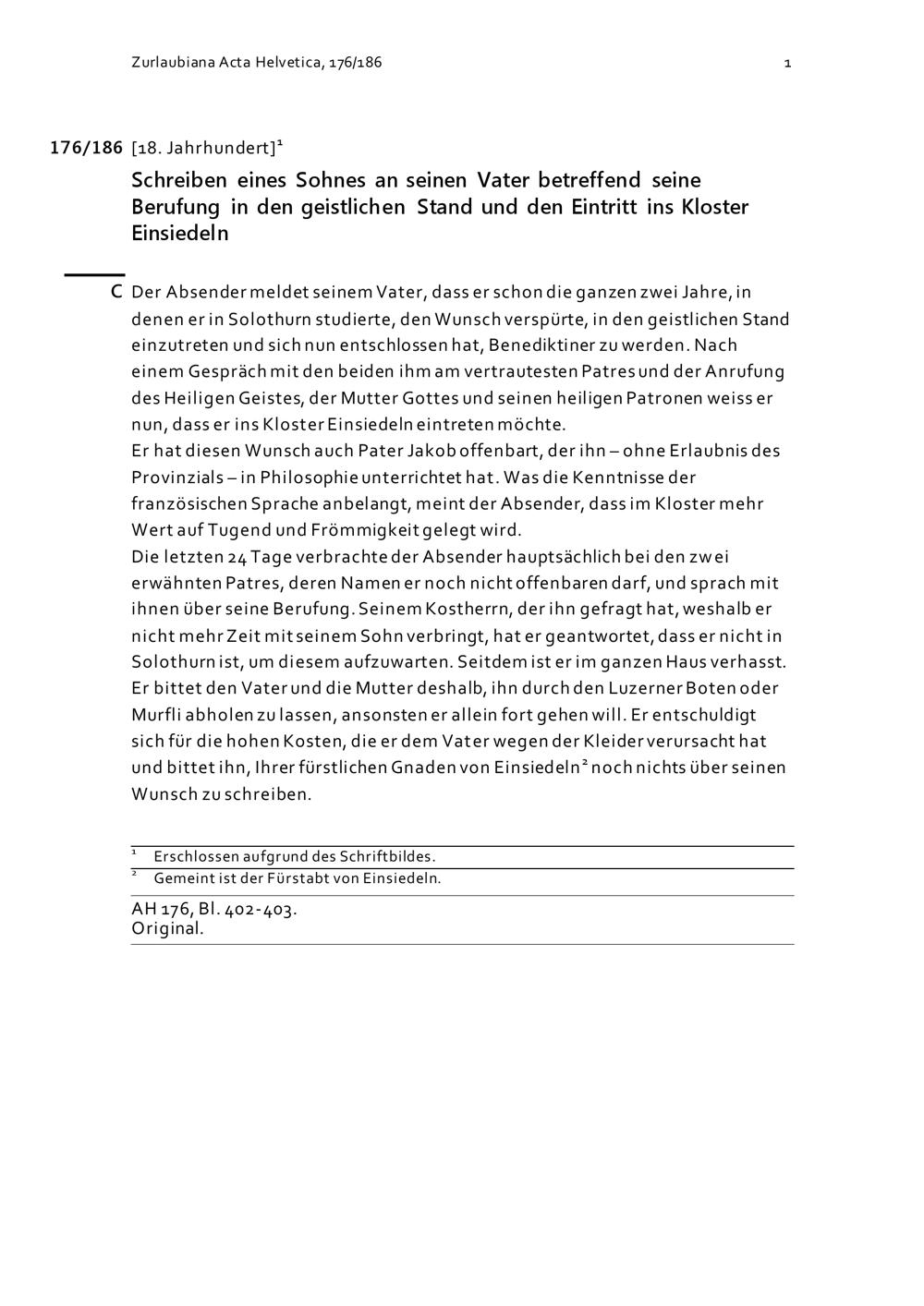 Schreiben eines Sohns an seinen Vater betreffend seine Berufung in den geistlichen Stand und den Eintritt ins Kloster Einsiedeln