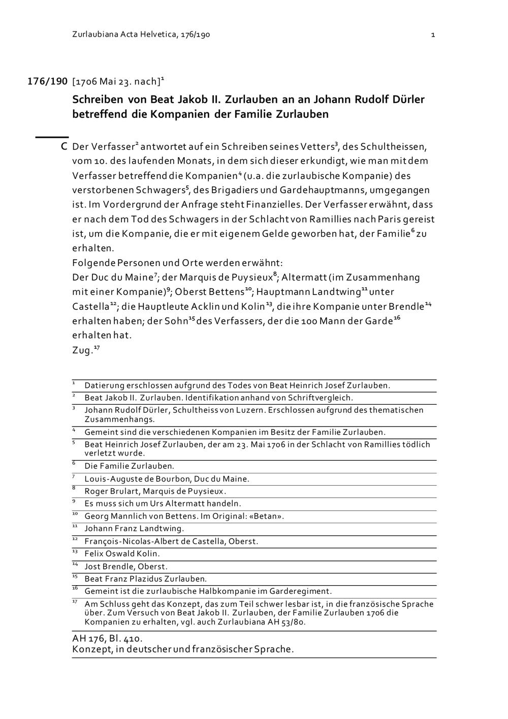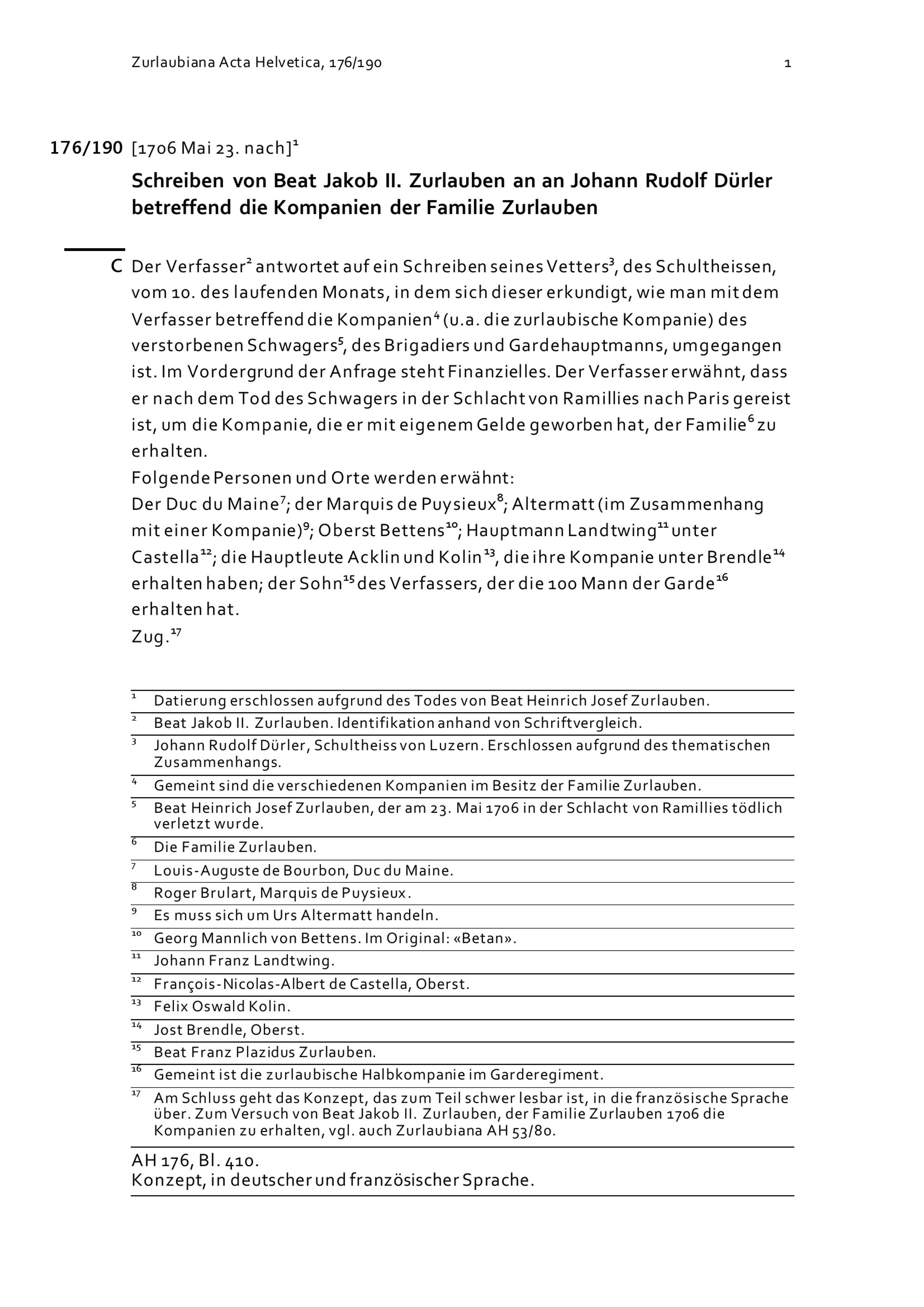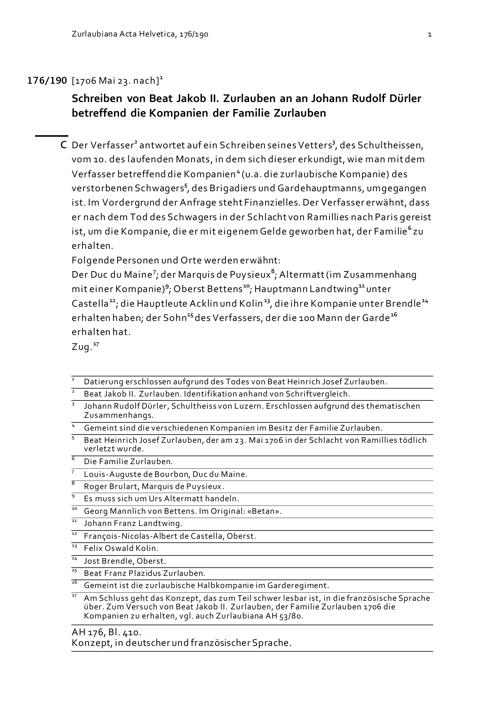 Schreiben von Beat Jakob II. Zurlauben an Johann Rudolf Dürler betreffend die Kompanien der Familie Zurlauben