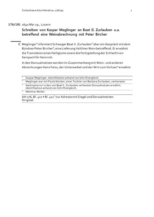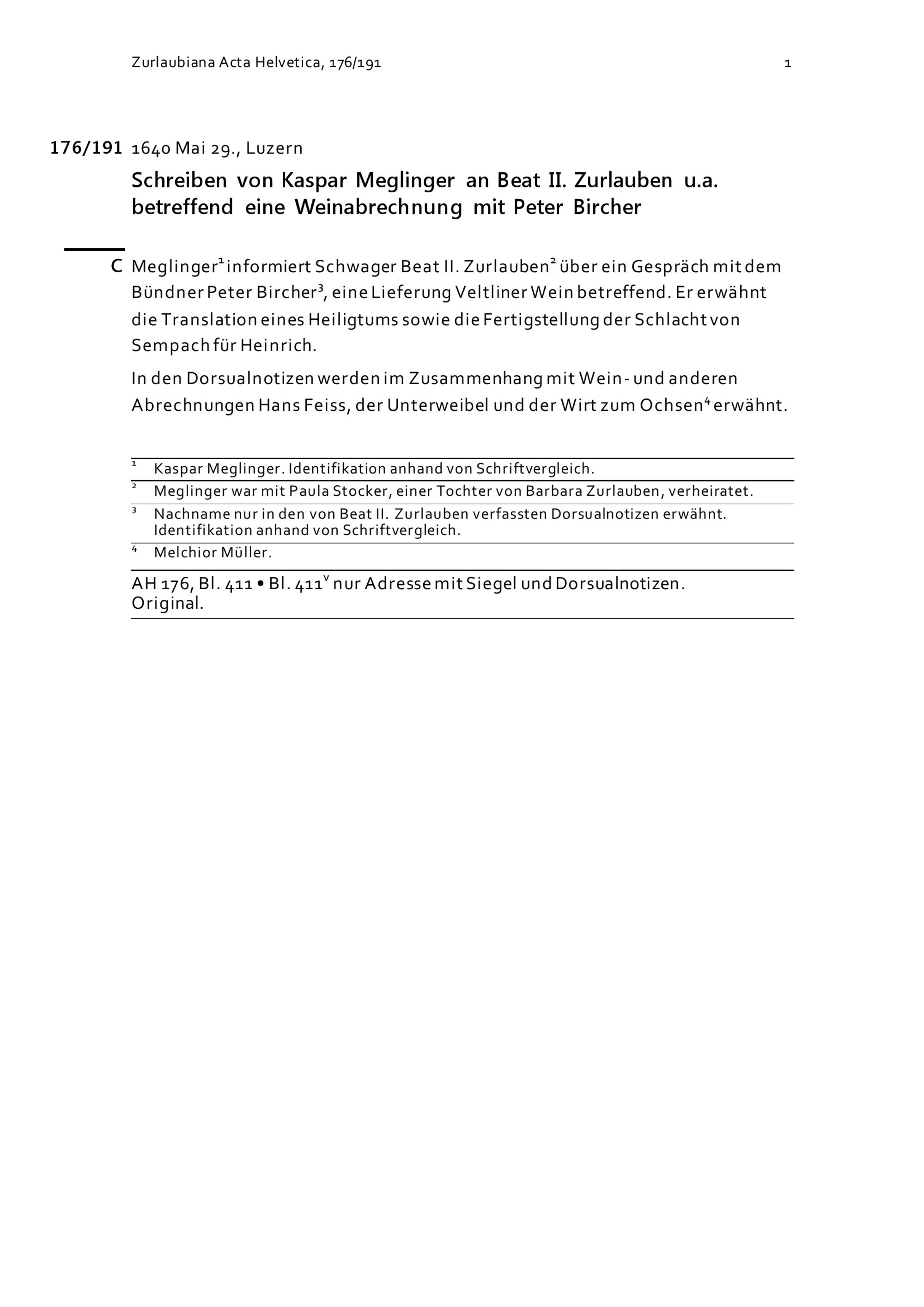 Schreiben von Kaspar Meglinger an Beat II. Zurlauben u.a. betreffend eine Weinabrechnung mit Peter Bircher