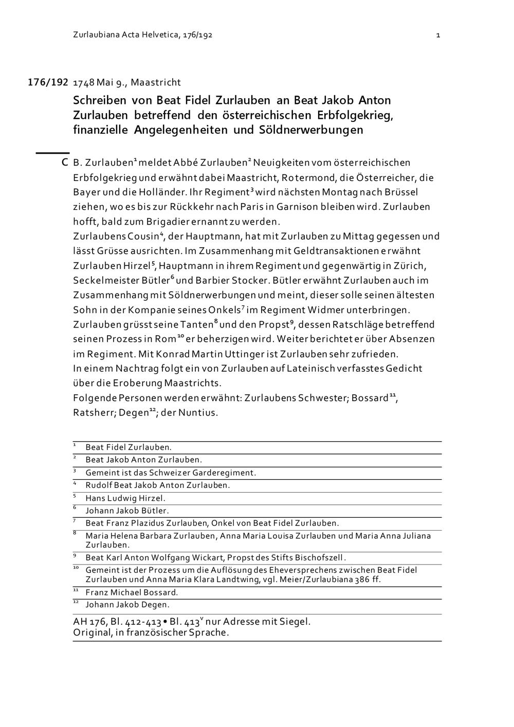 Schreiben von Beat Fidel Zurlauben an Beat Jakob Anton Zurlauben betreffend den österreichischen Erbfolgekrieg, finanzielle Angelegenheiten und Söldnerwerbungen