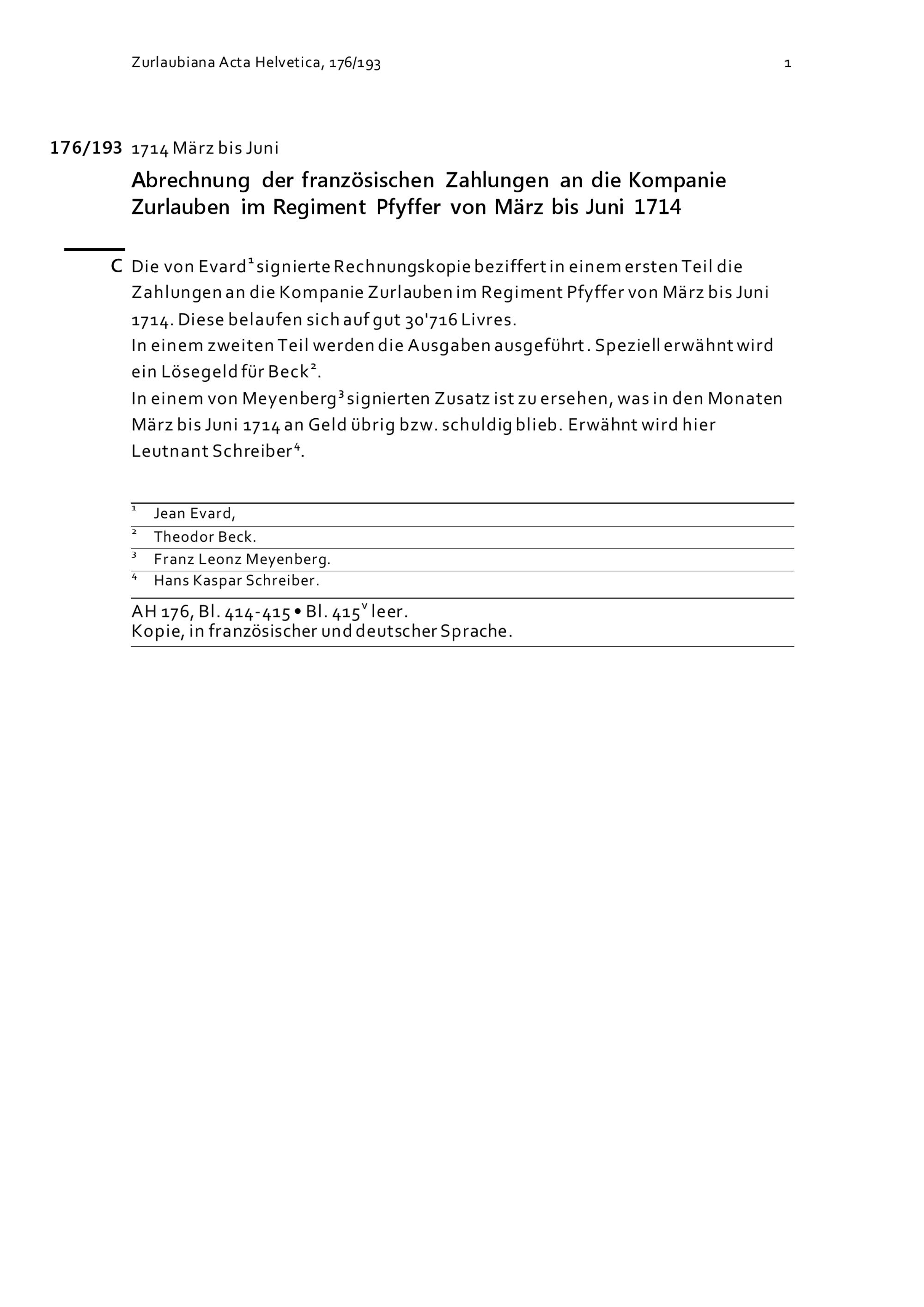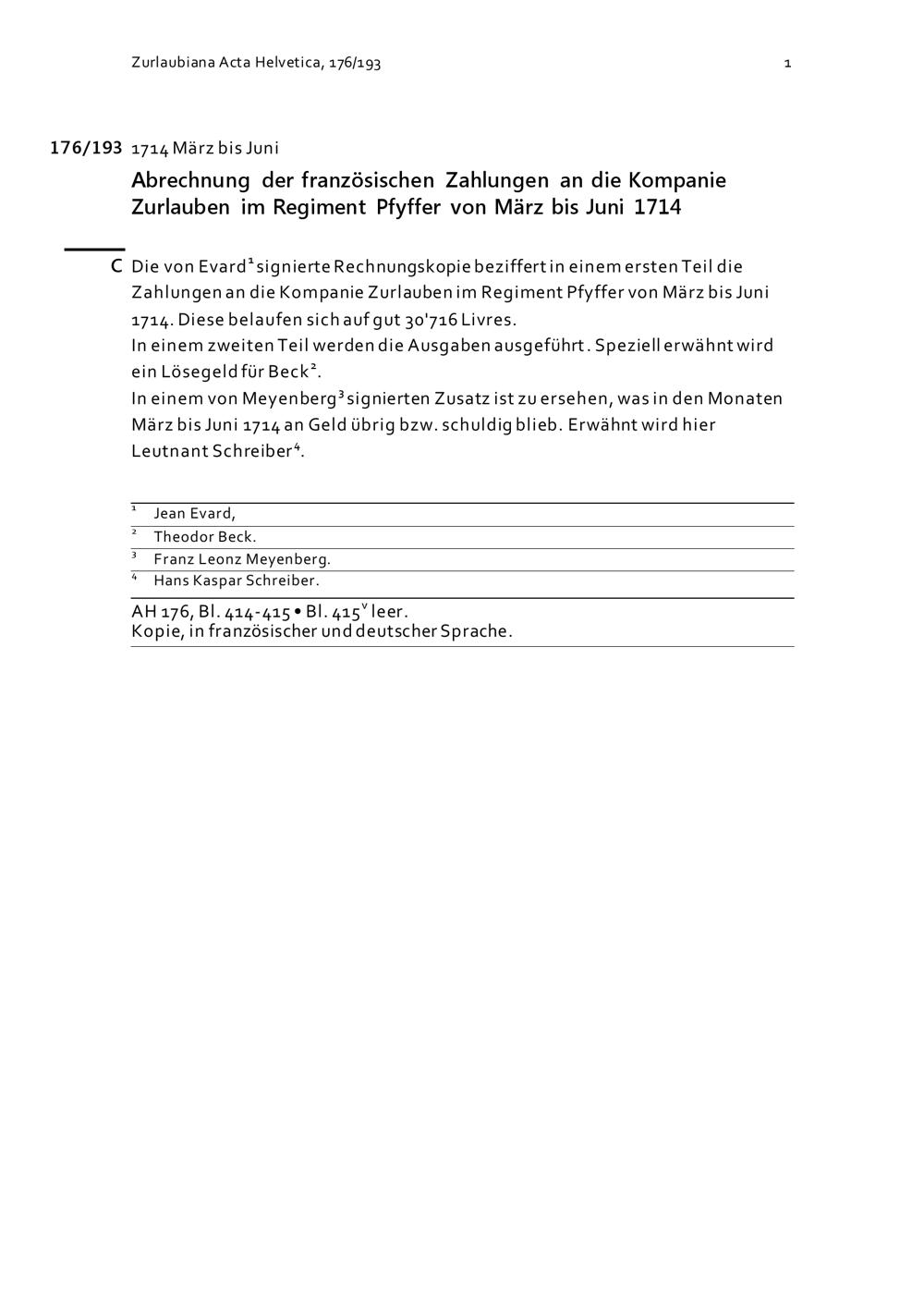 Abrechnung der französischen Zahlungen an die Kompanie Zurlauben im Regiment Pfyffer von März bis Juni 1714