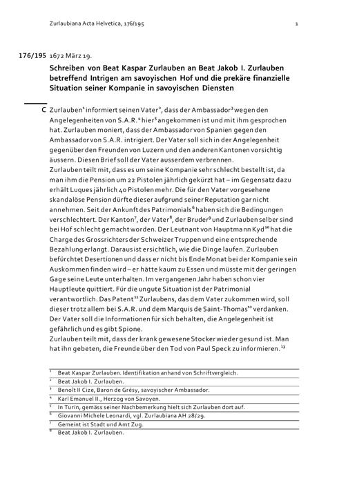 Schreiben von Beat Kaspar Zurlauben an Beat Jakob I. Zurlauben betreffend Intrigen am savoyischen Hof und die prekäre finanzielle Situation seiner Kompanie in savoyischen Diensten
