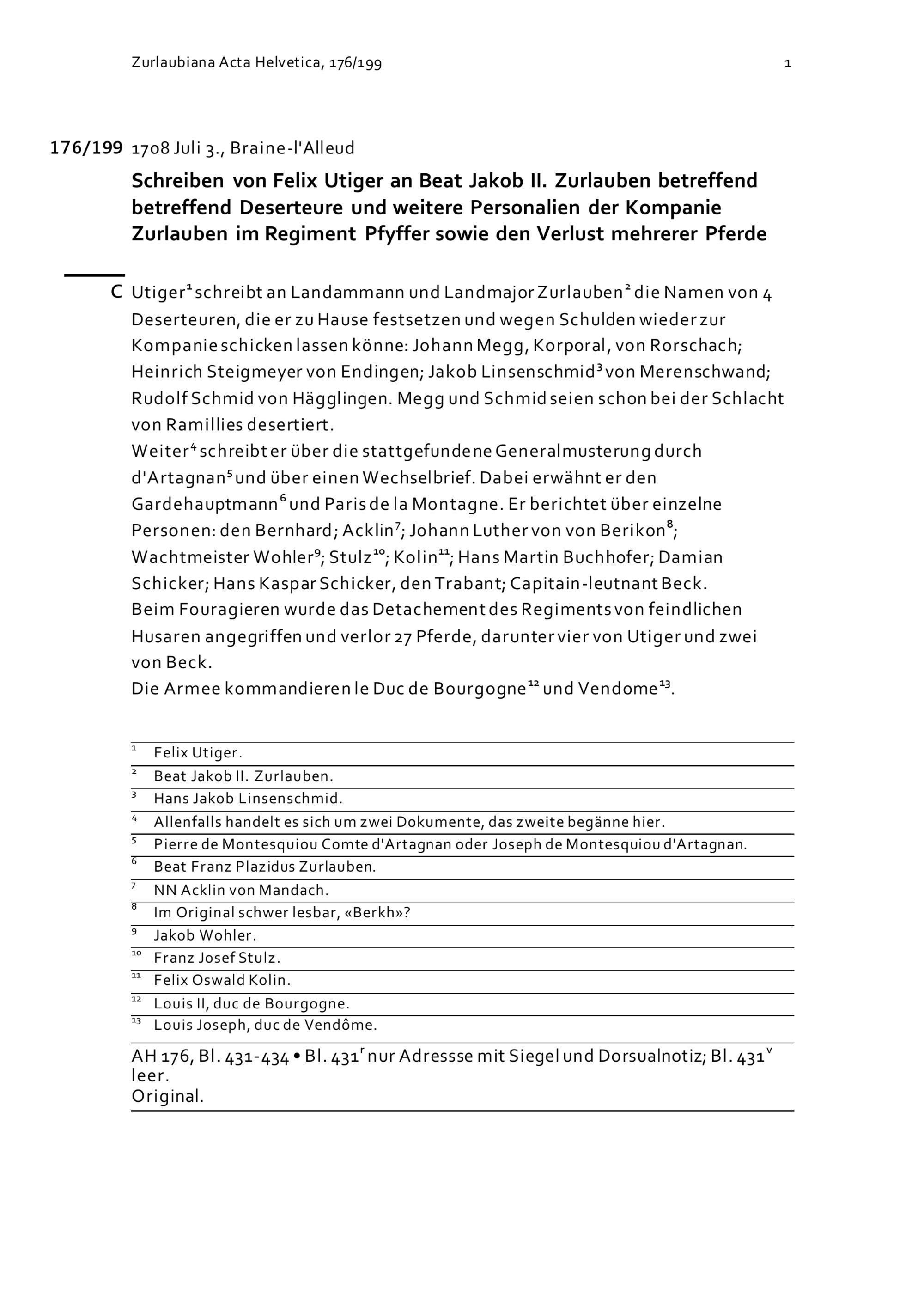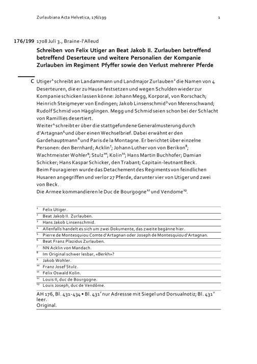 Schreiben von Felix Utiger an Beat Jakob II. Zurlauben betreffend Deserteure und weitere Personalien der Kompanie Zurlauben im Regiment Pfyffer sowie den Verlust mehrerer Pferde