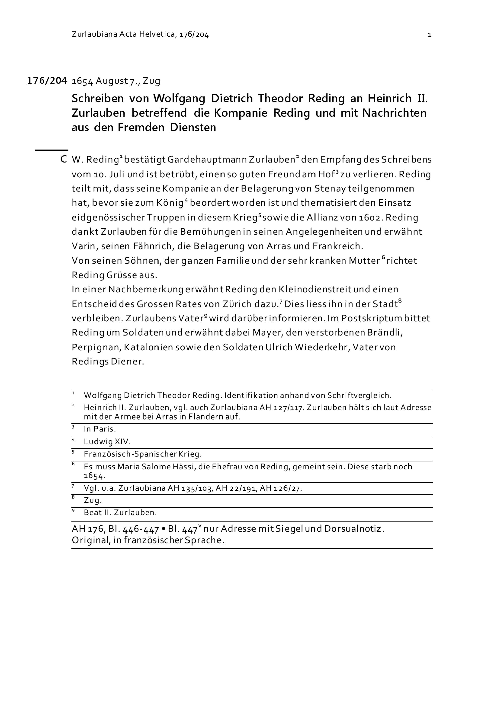 Schreiben von Wolfgang Dietrich Theodor Reding an Heinrich II. Zurlauben betreffend die Kompanie Reding und mit Nachrichten aus den Fremden Diensten