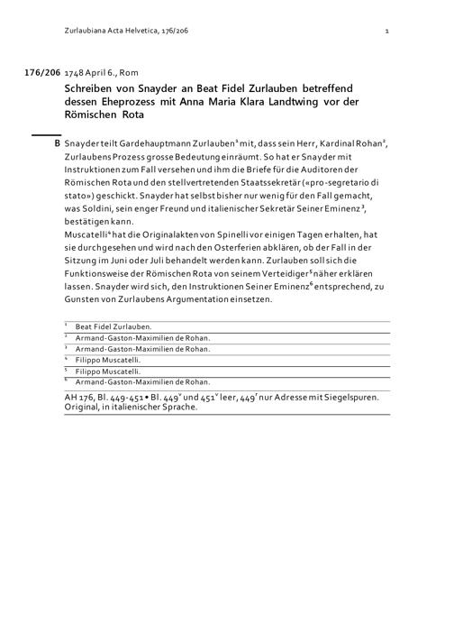 Schreiben von Snayder an Beat Fidel Zurlauben betreffend dessen Eheprozess mit Anna Maria Klara Landtwing vor der Römischen Rota