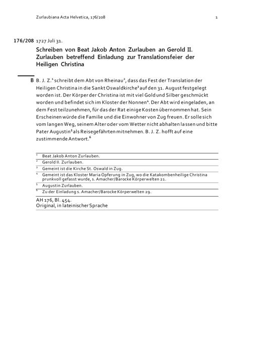 Schreiben von Beat Jakob Anton Zurlauben an Gerold II. Zurlauben betreffend Einladung zur Translationsfeier der Heiligen Christina