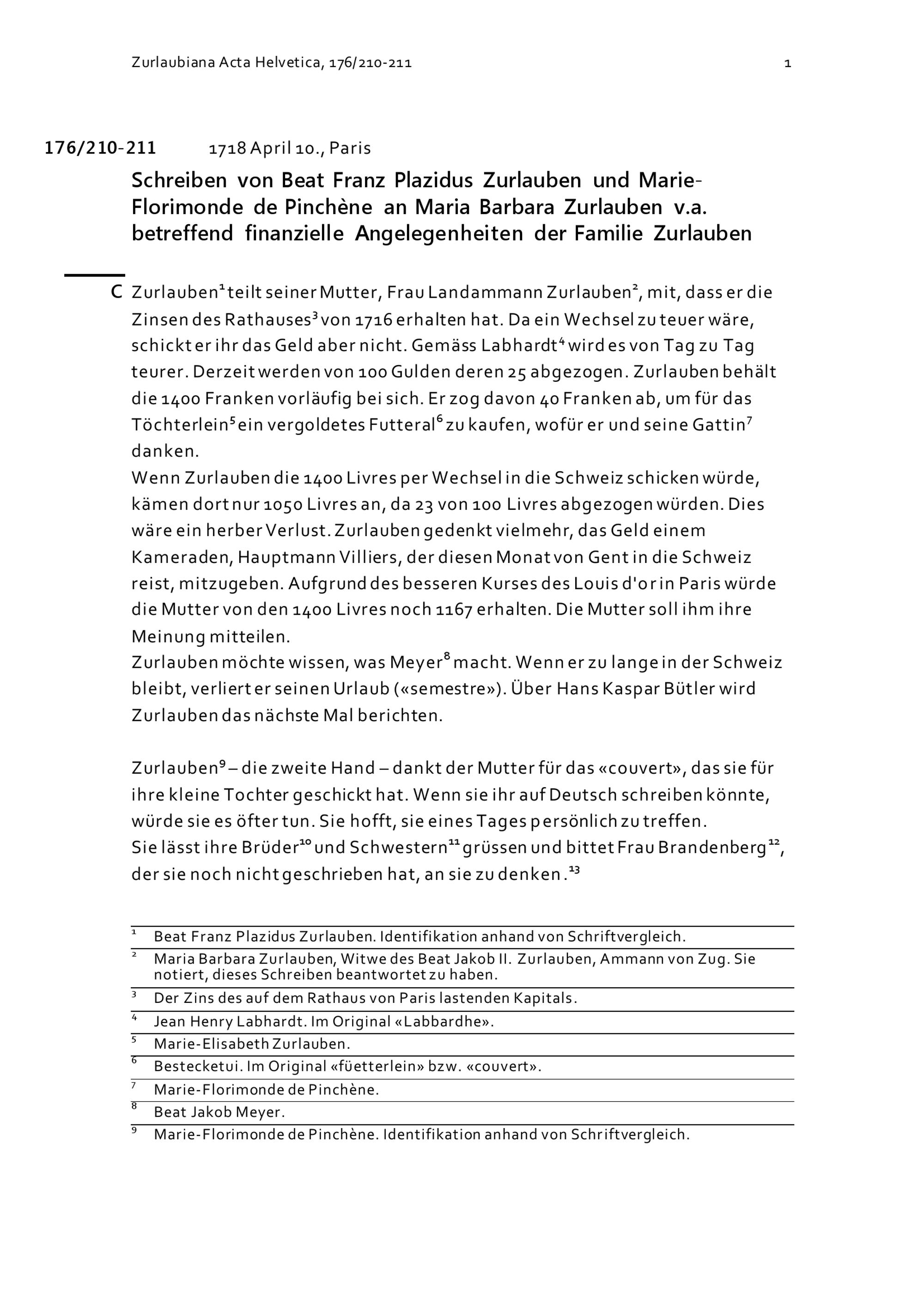 Schreiben von Beat Franz Plazidus Zurlauben und Marie-Florimonde de Pinchène an Maria Barbara Zurlauben v.a. betreffend finanzielle Angelegenheiten der Familie Zurlauben