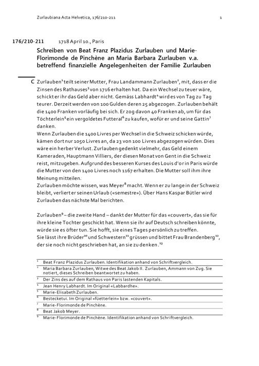 Schreiben von Beat Franz Plazidus Zurlauben und Marie-Florimonde de Pinchène an Maria...