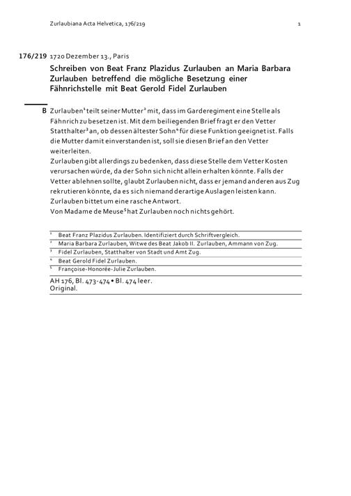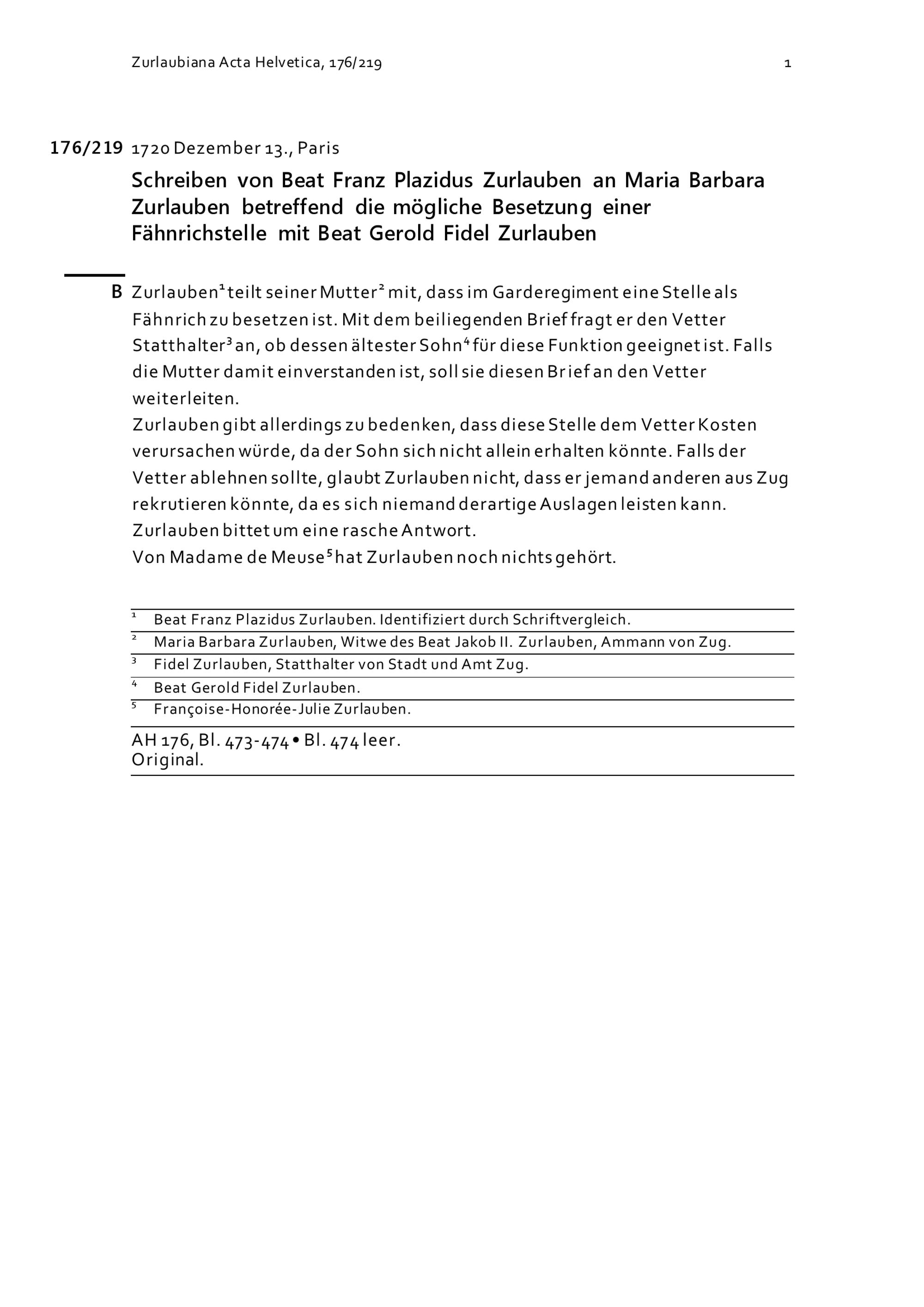 Schreiben von Beat Franz Plazidus Zurlauben an Maria Barbara Zurlauben betreffend...