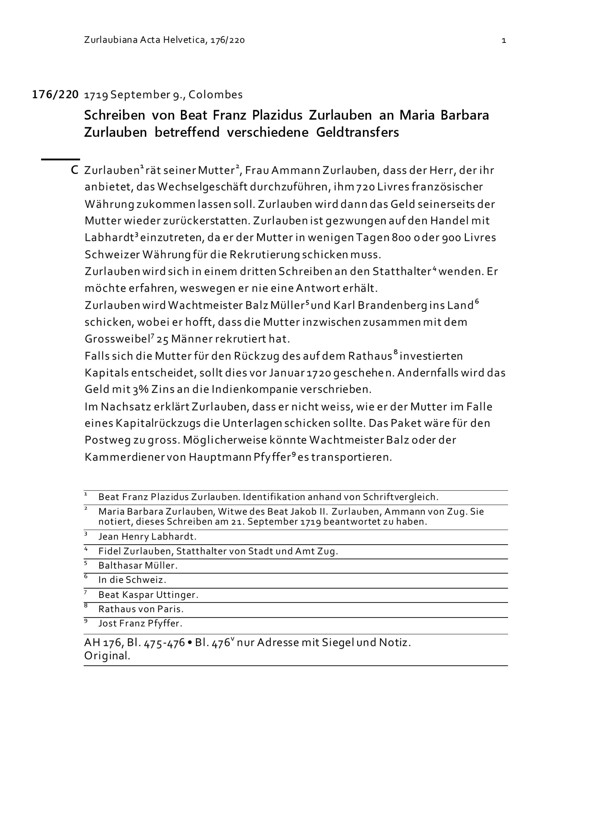 Schreiben von Beat Franz Plazidus Zurlauben an Maria Barbara Zurlauben betreffend verschiedene Geldtransfers