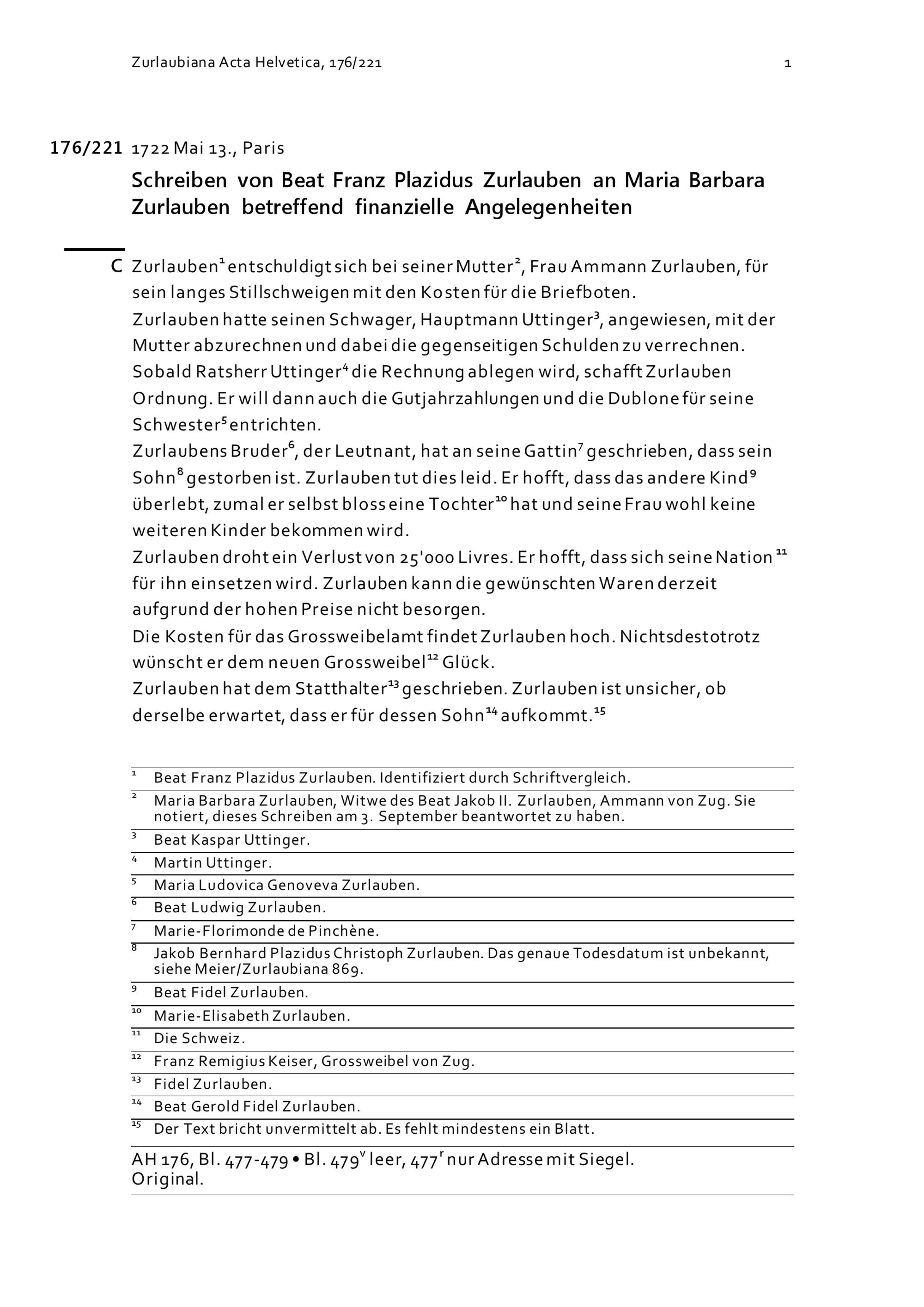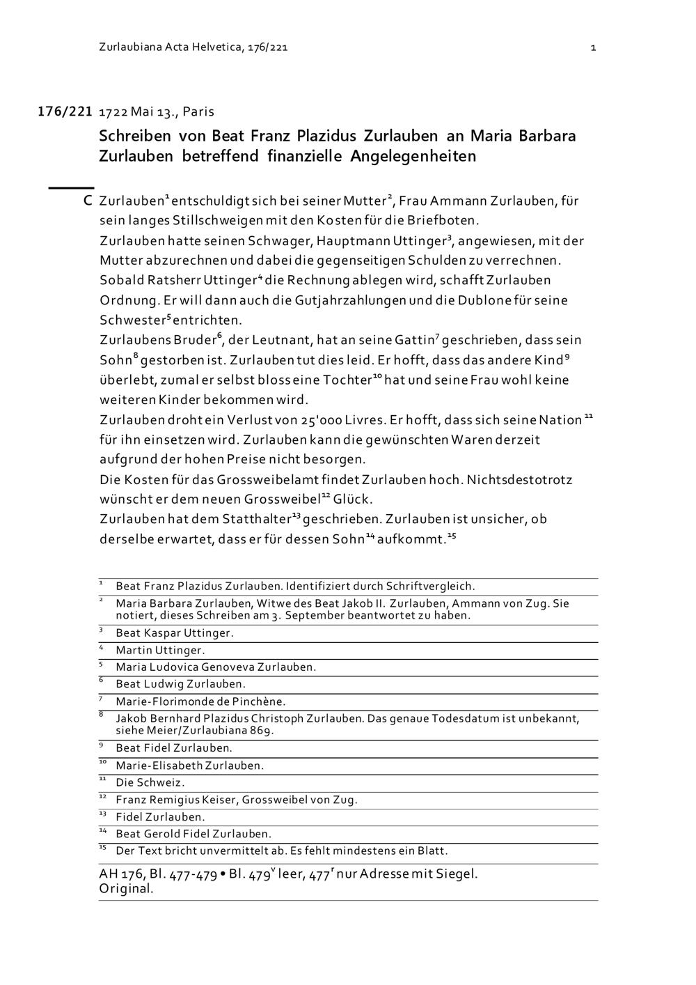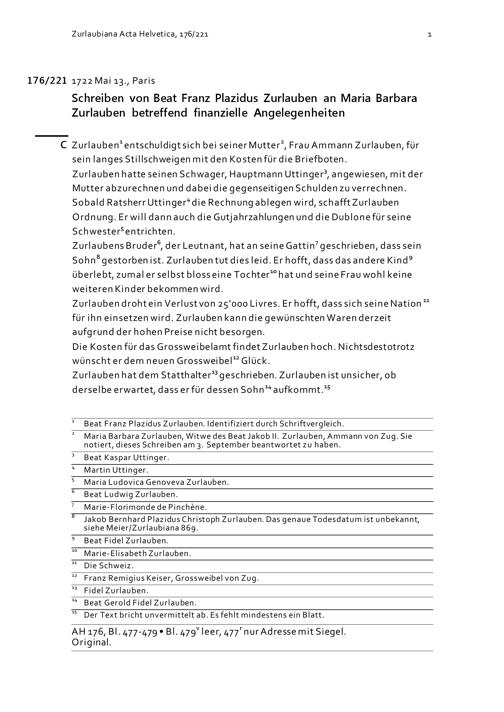 Schreiben von Beat Franz Plazidus Zurlauben an Maria Barbara Zurlauben betreffend...