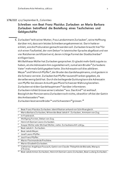 Schreiben von Beat Franz Plazidus Zurlauben an Maria Barbara Zurlauben betreffend...