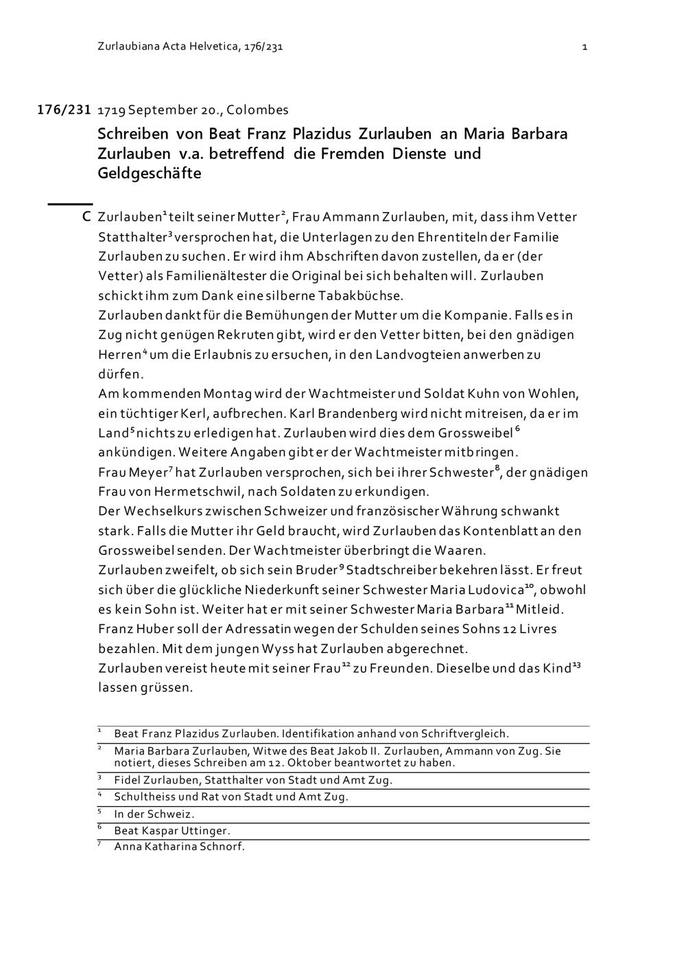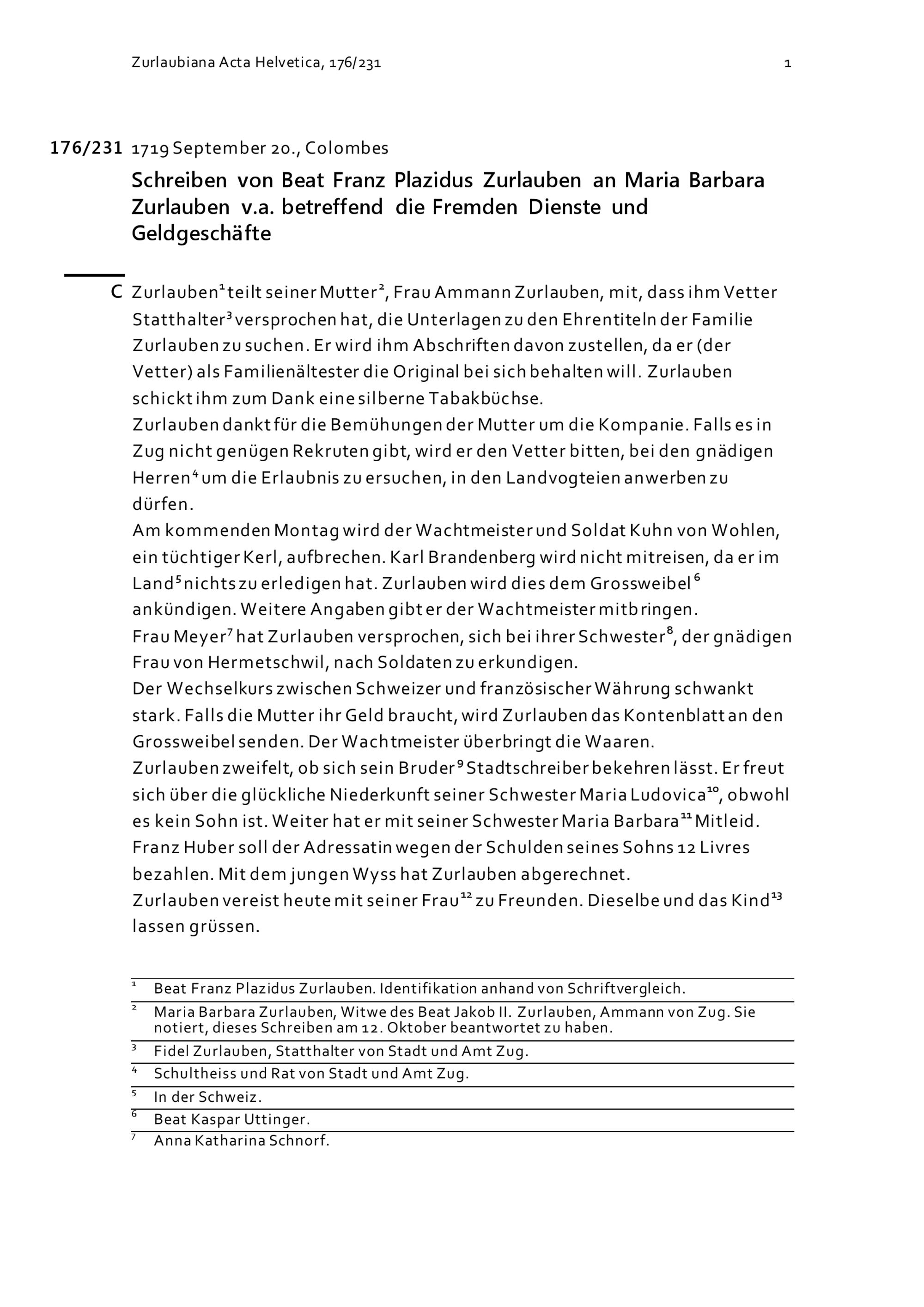 Schreiben von Beat Franz Plazidus Zurlauben an Maria Barbara Zurlauben v.a. betreffend...
