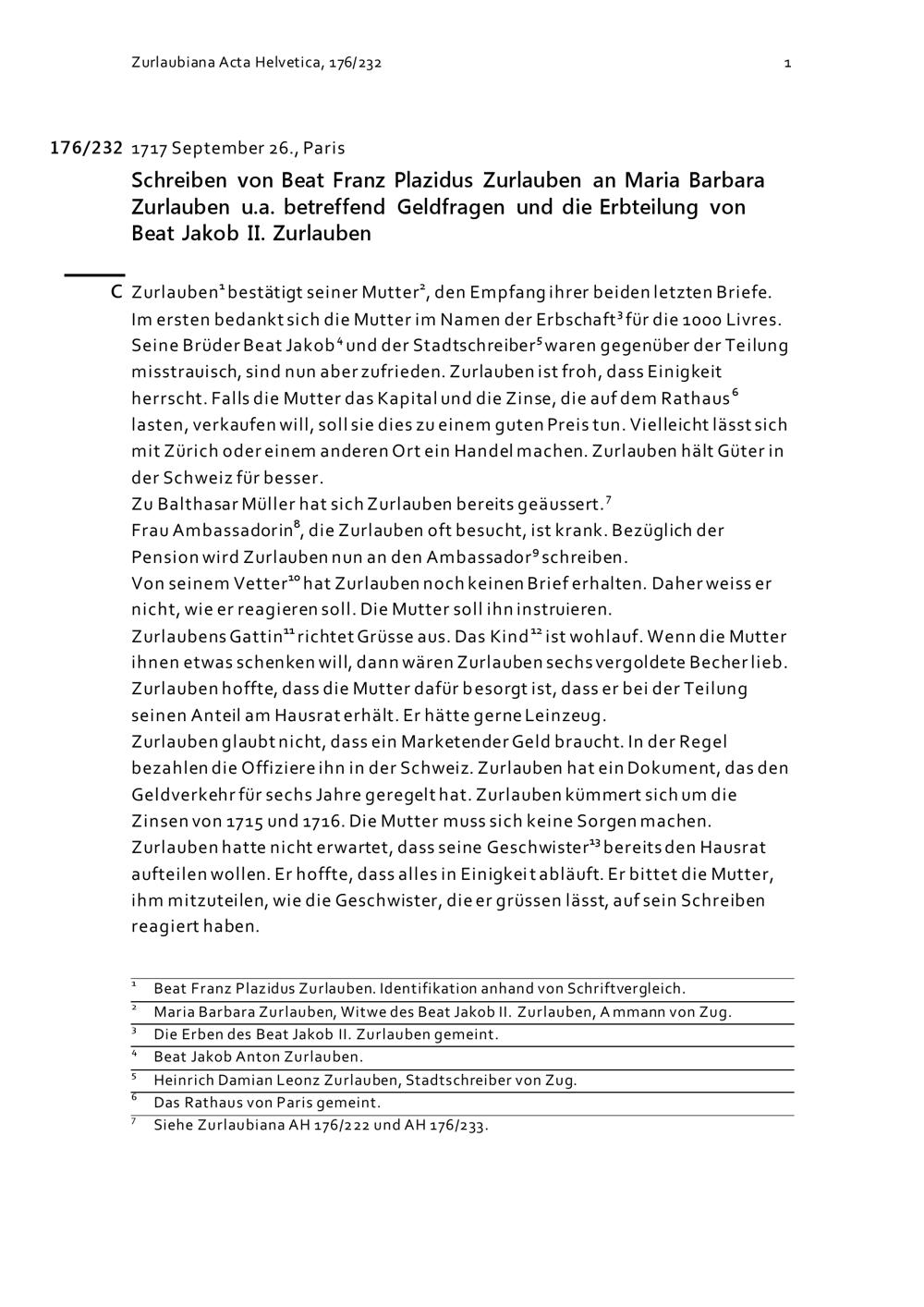 Schreiben von Beat Franz Plazidus Zurlauben an Maria Barbara Zurlauben u.a. betreffend Geldfragen und die Erbteilung von Beat Jakob II. Zurlauben