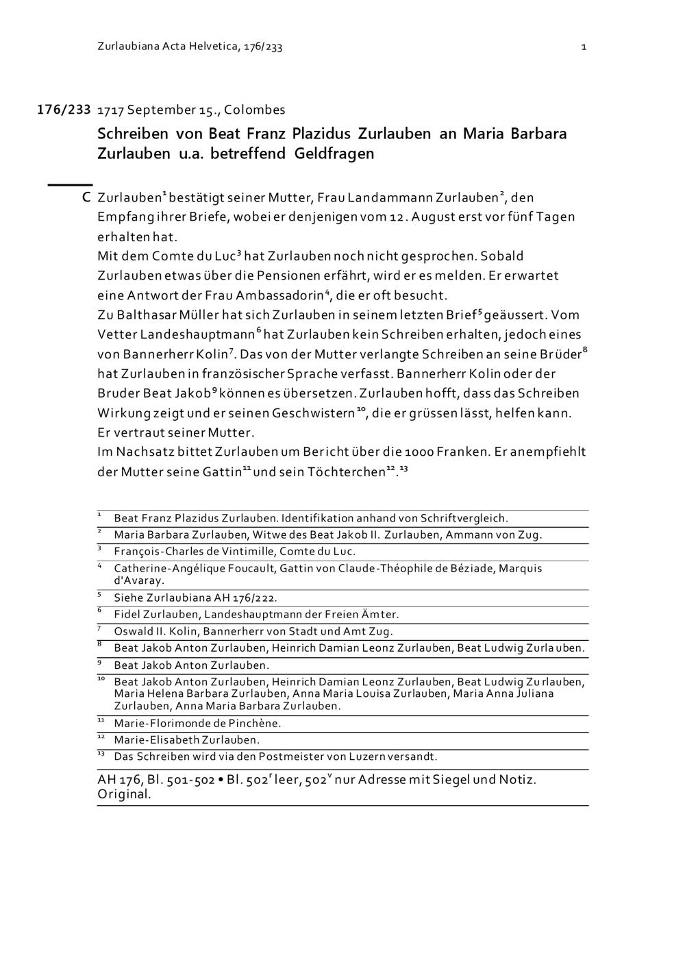 Schreiben von Beat Franz Plazidus Zurlauben an Maria Barbara Zurlauben u.a. betreffend...