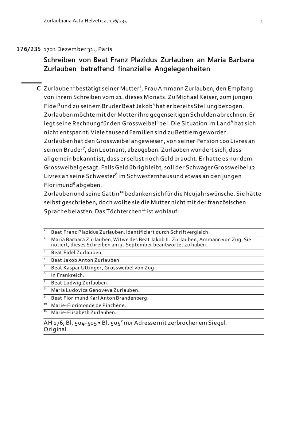 Schreiben von Beat Franz Plazidus Zurlauben an Maria Barbara Zurlauben betreffend...