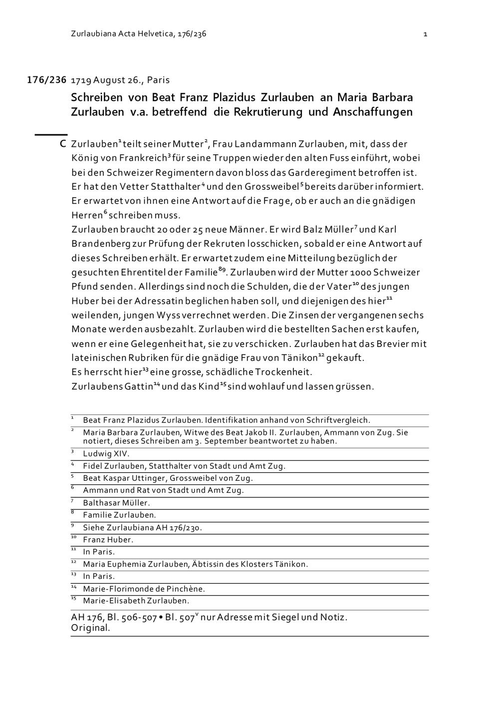 Schreiben von Beat Franz Plazidus Zurlauben an Maria Barbara Zurlauben v.a. betreffend...