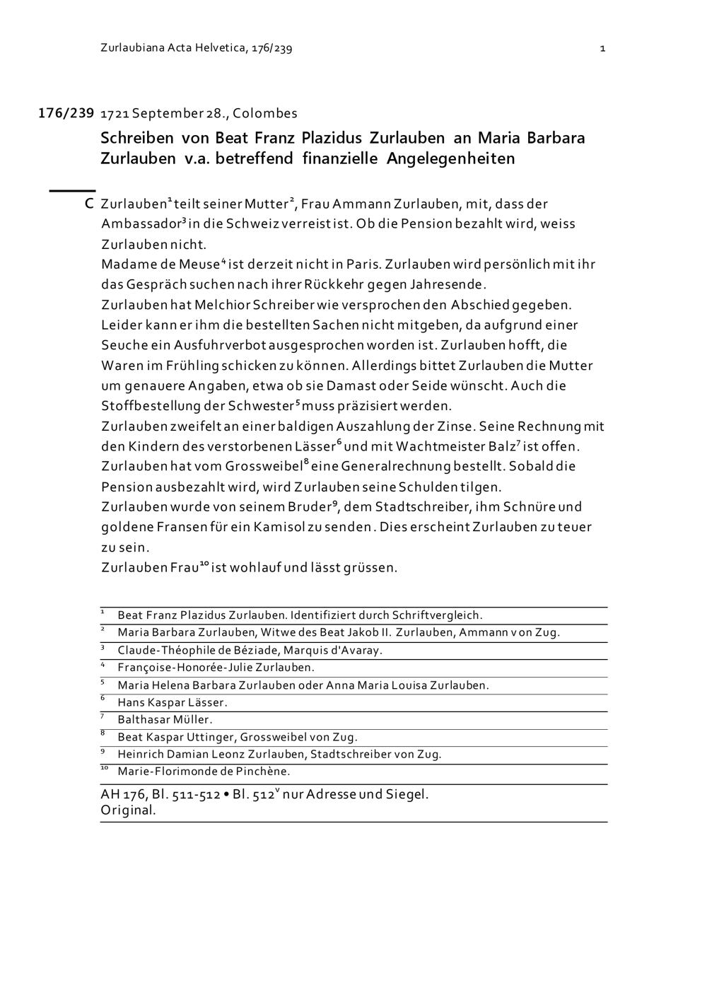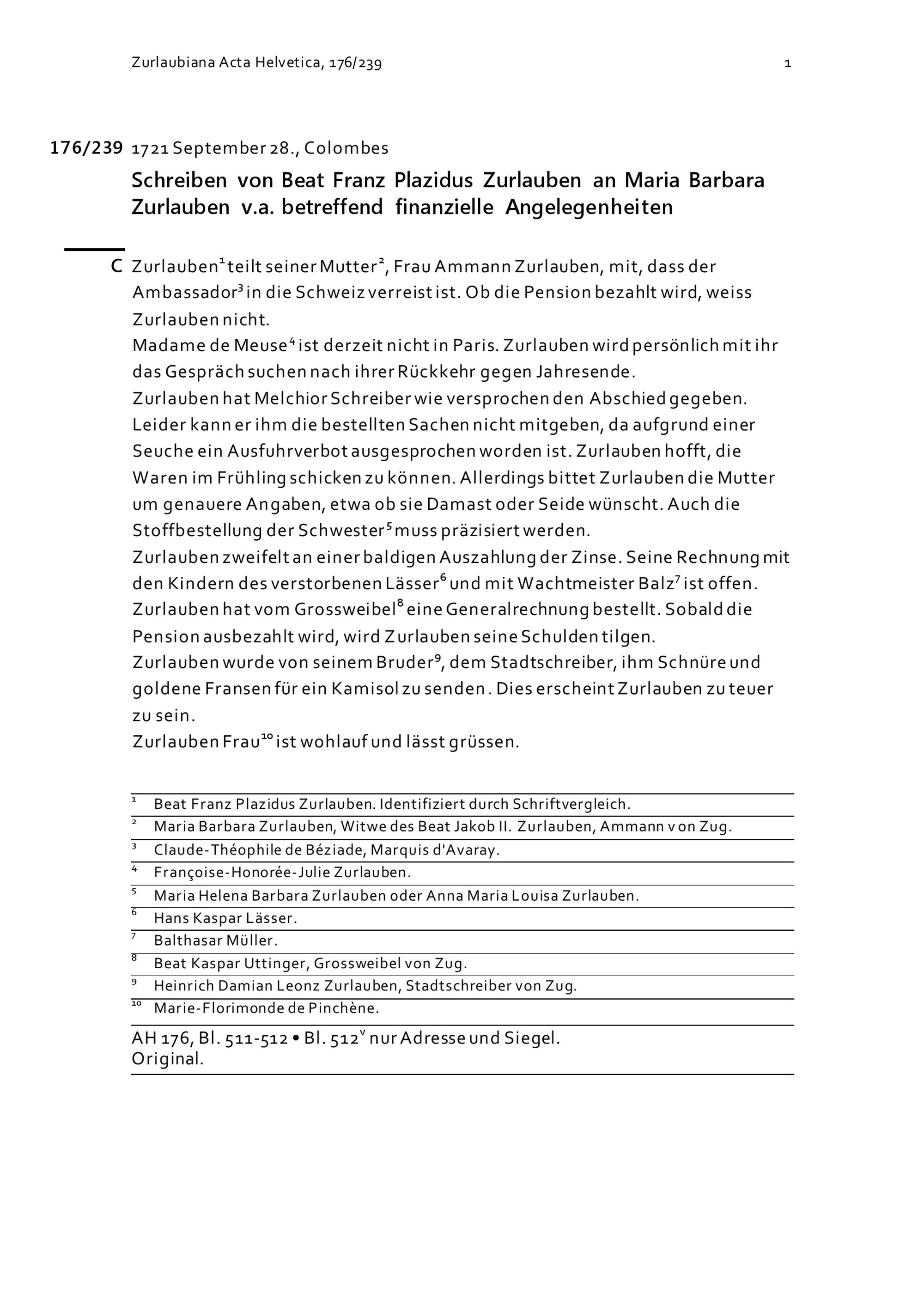 Schreiben von Beat Franz Plazidus Zurlauben an Maria Barbara Zurlauben v.a. betreffend...