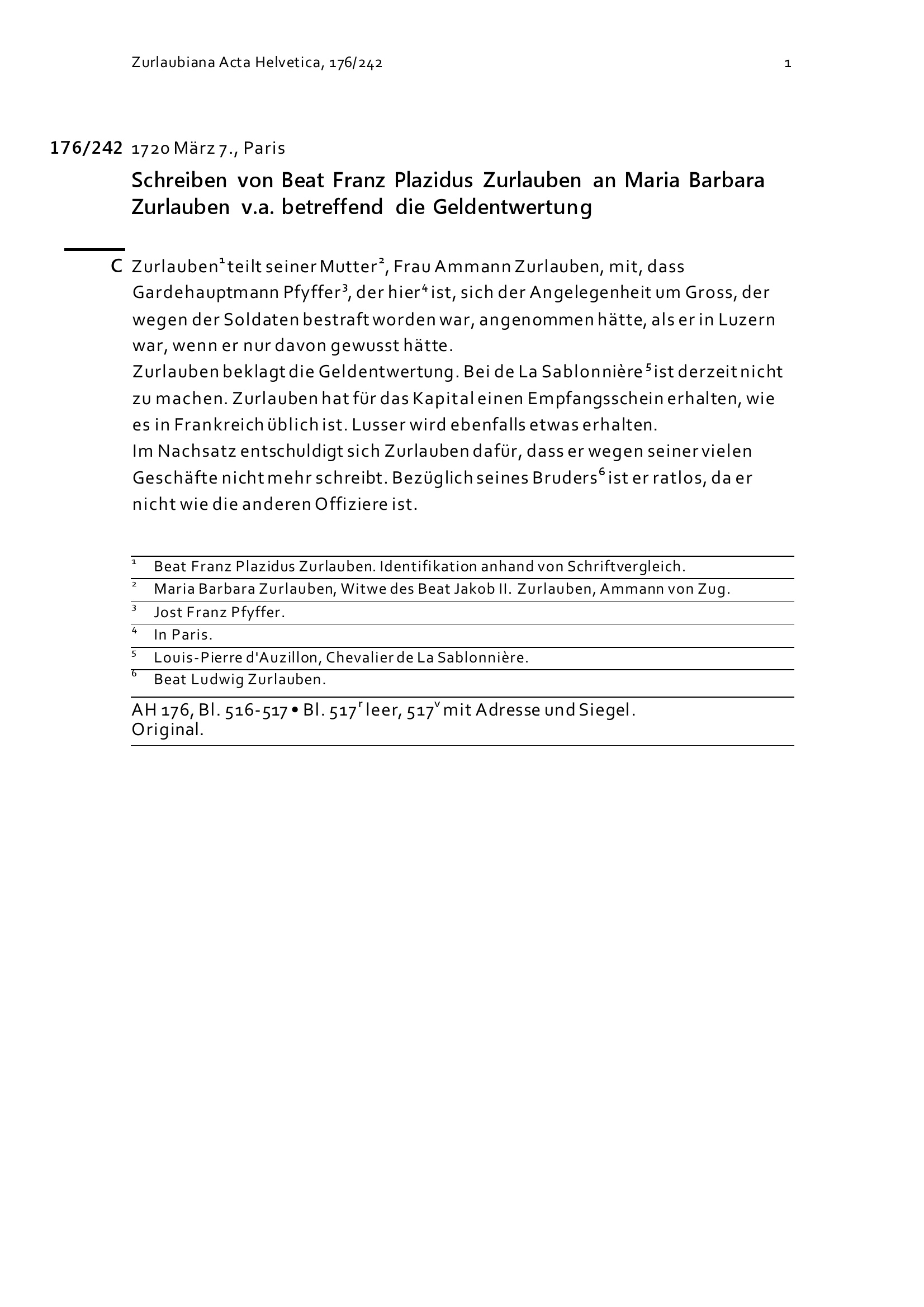 Schreiben von Beat Franz Plazidus Zurlauben an Maria Barbara Zurlauben v.a. betreffend...