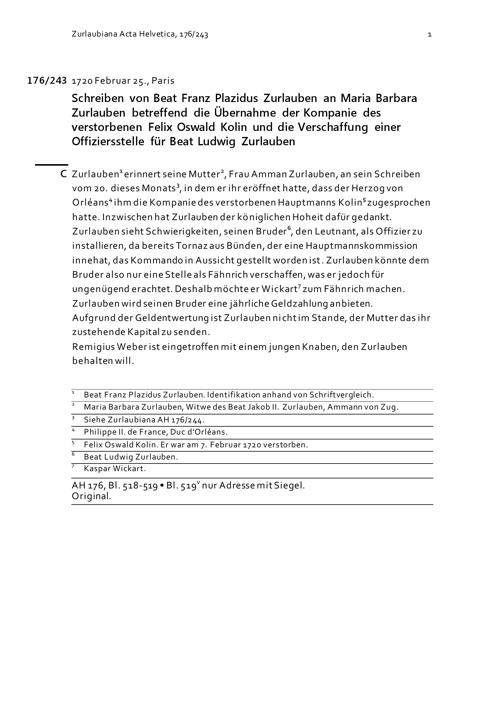 Schreiben von Beat Franz Plazidus Zurlauben an Maria Barbara Zurlauben betreffend die Übernahme der Kompanie des verstorbenen Felix Oswald Kolin und die Verschaffung einer Offiziersstelle für Beat Ludwig Zurlauben